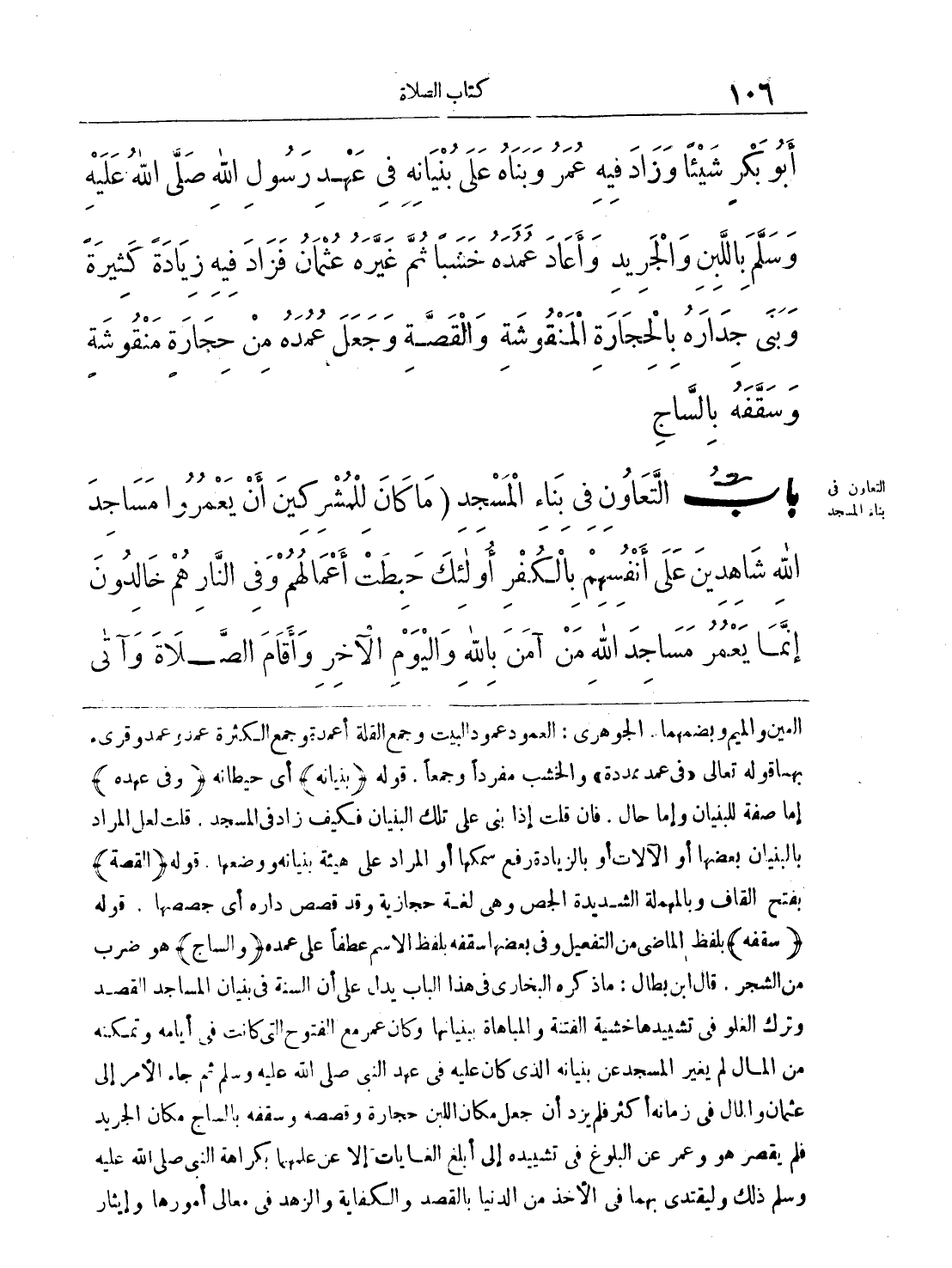 العين والميم وبضمهما. الجوهري: العمود عمود البيت وجمع القلة أعمدة وجمع الكثرة عمد وعمد وقرئ بهما قوله تعالى (في عمدٍ ممددة) والخشب مفرداً وجمعاً. قوله (بنيانه) أي حيطانه (وفي عهده) إما صفة للبنيان وإما حال. فإن قلت إذا بنى على تلك البنيان فكيف زاد في المسجد. قلت لعل المراد بالبنيان بعضها أو الآلات أو بالزيادة رفع سمكها أو المراد على هيئة بنيانه ووضعها. قوله (القصة) بفتح القاف وبالمهمة الشديدة الجص وهي لغة حجازية وقد قصص داره أي جصصها. قوله (سقفه) بلفظ الماضي من التفعيل وفي بعضها سقفه بلفظ الاسم عطفاً على عمده (والساج) هو ضرب من الشجر. قال ابن بطال: ما ذكره البخاري في هذا الباب يدل على أن السنة في بنيان المساجد القصد وترك الغلو في تشييدها خشية الفتنة والمباهاة ببنيانها وكان عمر مع الفتوح التي كانت في أيامه وتمكنه من المال لم يغير المسجد عن بنيانه الذي كان عليه في عهد النبي - صلى الله عليه وسلم - ثم جاء الأمر إلى عثمان والمال في زمانه أكثر فلم يزد أن جعل مكان اللبن حجارة وقصصه وسقفه بالساج مكان الجريد فلم يقصر هو وعمر عن البلوغ في تشييده إلى أبلغ الغايات إلا عن علمهما بكراهة النبي - صلى الله عليه وسلم - ذلك وليقتدي بهما في الأخذ من الدنيا بالقصد والكفاية والزهد في معالي أمورها وإيثار
