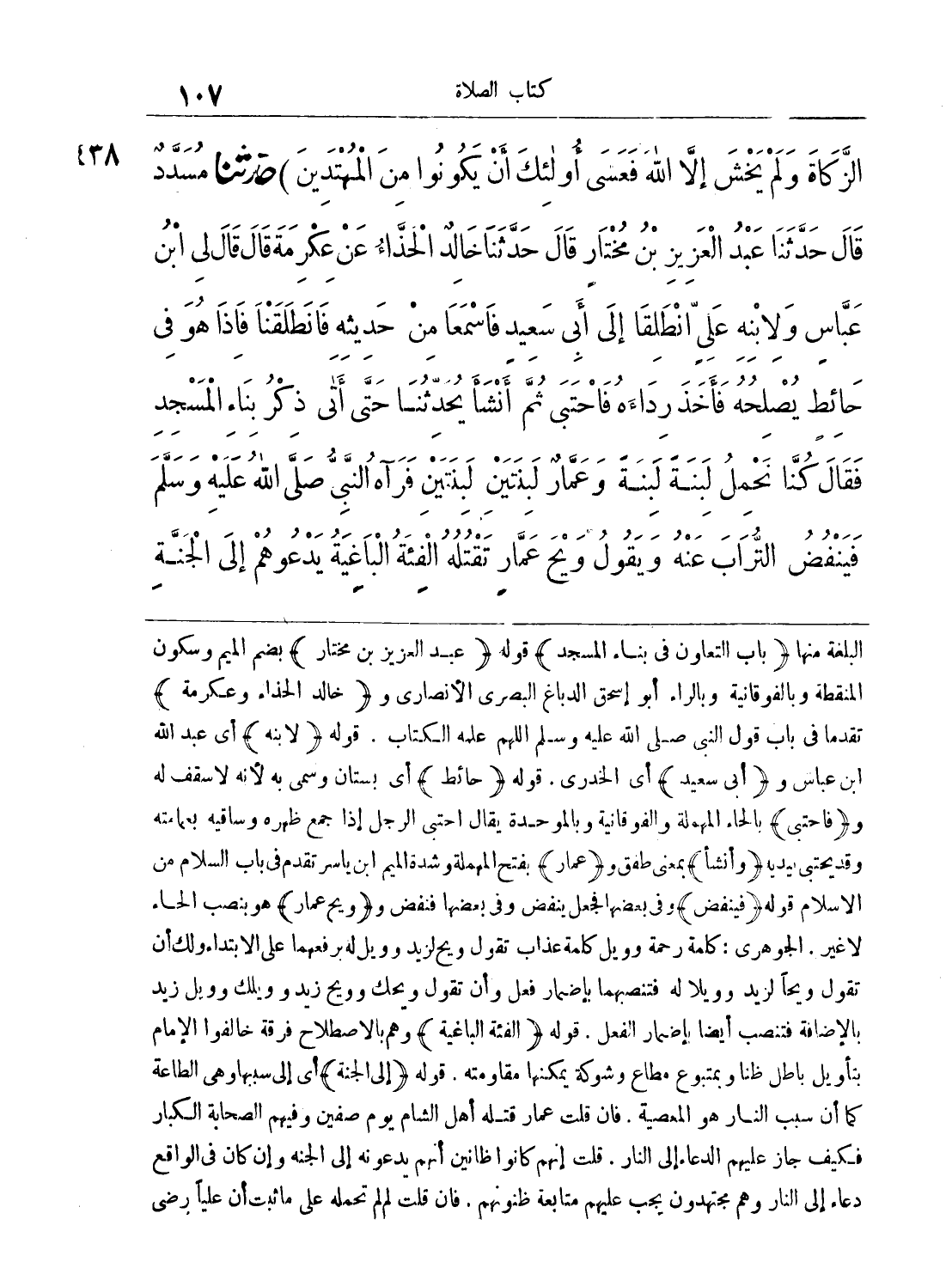 438 - حَدَّثَنَا مُسَدَّدٌ قَالَ حَدَّثَنَا عَبْدُ الْعَزِيزِ بْنُ مُخْتَارٍ قَالَ حَدَّثَنَا خَالِدٌ الْحَذَّاءُ عَنْ عِكْرِمَةَ قَالَ لِى ابْنُ عَبَّاسٍ وَلاِبْنِهِ عَلِىٍّ انْطَلِقَا إِلَى أَبِى سَعِيدٍ فَاسْمَعَا مِنْ حَدِيثِهِ. فَانْطَلَقْنَا فَإِذَا هُوَ فِى حَائِطٍ يُصْلِحُهُ، فَأَخَذَ رِدَاءَهُ فَاحْتَبَى، ثُمَّ أَنْشَأَ يُحَدِّثُنَا حَتَّى أَتَى ذِكْرُ بِنَاءِ الْمَسْجِدِ فَقَالَ كُنَّا نَحْمِلُ لَبِنَةً لَبِنَةً، وَعَمَّارٌ لَبِنَتَيْنِ لَبِنَتَيْنِ، فَرَآهُ النَّبِىُّ - صلى الله عليه وسلم - فَيَنْفُضُ التُّرَابَ عَنْهُ وَيَقُولُ «وَيْحَ عَمَّارٍ تَقْتُلُهُ الْفِئَةُ الْبَاغِيَةُ، يَدْعُوهُمْ إِلَى الْجَنَّةِ