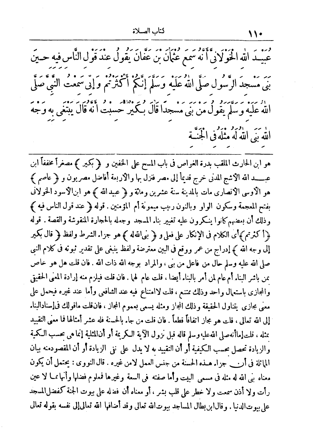عُبَيْدَ اللَّهِ الْخَوْلاَنِىَّ أَنَّهُ سَمِعَ عُثْمَانَ بْنَ عَفَّانَ يَقُولُ عِنْدَ قَوْلِ النَّاسِ فِيهِ حِينَ بَنَى مَسْجِدَ الرَّسُولِ - صلى الله عليه وسلم - إِنَّكُمْ أَكْثَرْتُمْ، وَإِنِّى سَمِعْتُ النَّبِىَّ - صلى الله عليه وسلم - يَقُولُ «مَنْ بَنَى مَسْجِدًا - قَالَ بُكَيْرٌ حَسِبْتُ أَنَّهُ قَالَ - يَبْتَغِى بِهِ وَجْهَ اللَّهِ، بَنَى اللَّهُ لَهُ مِثْلَهُ فِى الْجَنَّةِ»