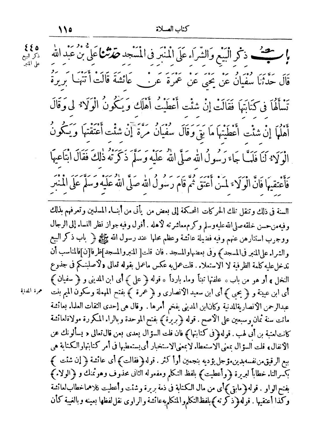 445 - حَدَّثَنَا عَلِىُّ بْنُ عَبْدِ اللَّهِ قَالَ حَدَّثَنَا سُفْيَانُ عَنْ يَحْيَى عَنْ عَمْرَةَ عَنْ عَائِشَةَ قَالَتْ أَتَتْهَا بَرِيرَةُ تَسْأَلُهَا فِى كِتَابَتِهَا فَقَالَتْ إِنْ شِئْتِ أَعْطَيْتُ أَهْلَكِ وَيَكُونُ الْوَلاَءُ لِى. وَقَالَ أَهْلُهَا إِنْ شِئْتِ أَعْطَيْتِهَا مَا بَقِىَ - وَقَالَ سُفْيَانُ مَرَّةً إِنْ شِئْتِ أَعْتَقْتِهَا وَيَكُونُ الْوَلاَءُ لَنَا - فَلَمَّا جَاءَ رَسُولُ اللَّهِ - صلى الله عليه وسلم - ذَكَّرَتْهُ ذَلِكَ فَقَالَ «ابْتَاعِيهَا فَأَعْتِقِيهَا، فَإِنَّ الْوَلاَءَ لِمَنْ أَعْتَقَ». ثُمَّ قَامَ رَسُولُ اللَّهِ - صلى الله عليه وسلم - عَلَى الْمِنْبَرِ