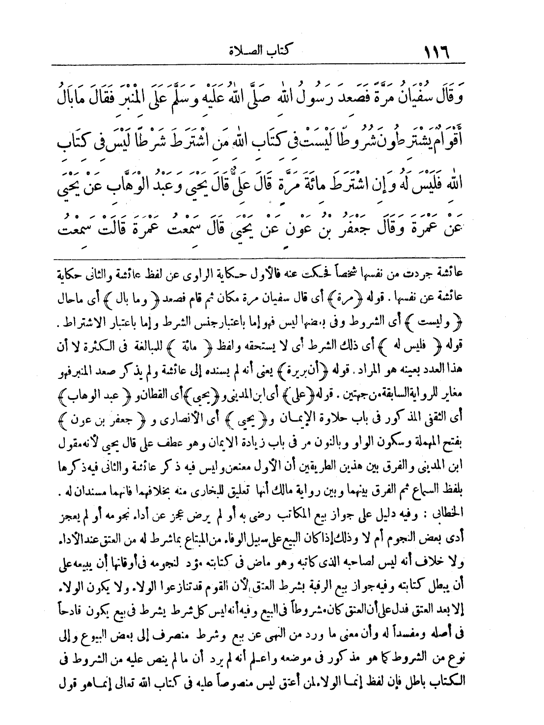 وَقَالَ سُفْيَانُ مَرَّةً فَصَعِدَ رَسُولُ اللَّهِ - صلى الله عليه وسلم - عَلَى الْمِنْبَرِ - فَقَالَ «مَا بَالُ أَقْوَامٍ يَشْتَرِطُونَ شُرُوطاً لَيْسَتْ فِى كِتَابِ اللَّهِ، مَنِ اشْتَرَطَ شَرْطاً لَيْسَ فِى كِتَابِ اللَّهِ فَلَيْسَ لَهُ، وَإِنِ اشْتَرَطَ مِائَةَ مَرَّةٍ». قَالَ عَلِىٌّ قَالَ يَحْيَى وَعَبْدُ الْوَهَّابِ عَنْ يَحْيَى عَنْ عَمْرَةَ. وَقَالَ جَعْفَرُ بْنُ عَوْنٍ عَنْ يَحْيَى قَالَ سَمِعْتُ عَمْرَةَ قَالَتْ سَمِعْتُ