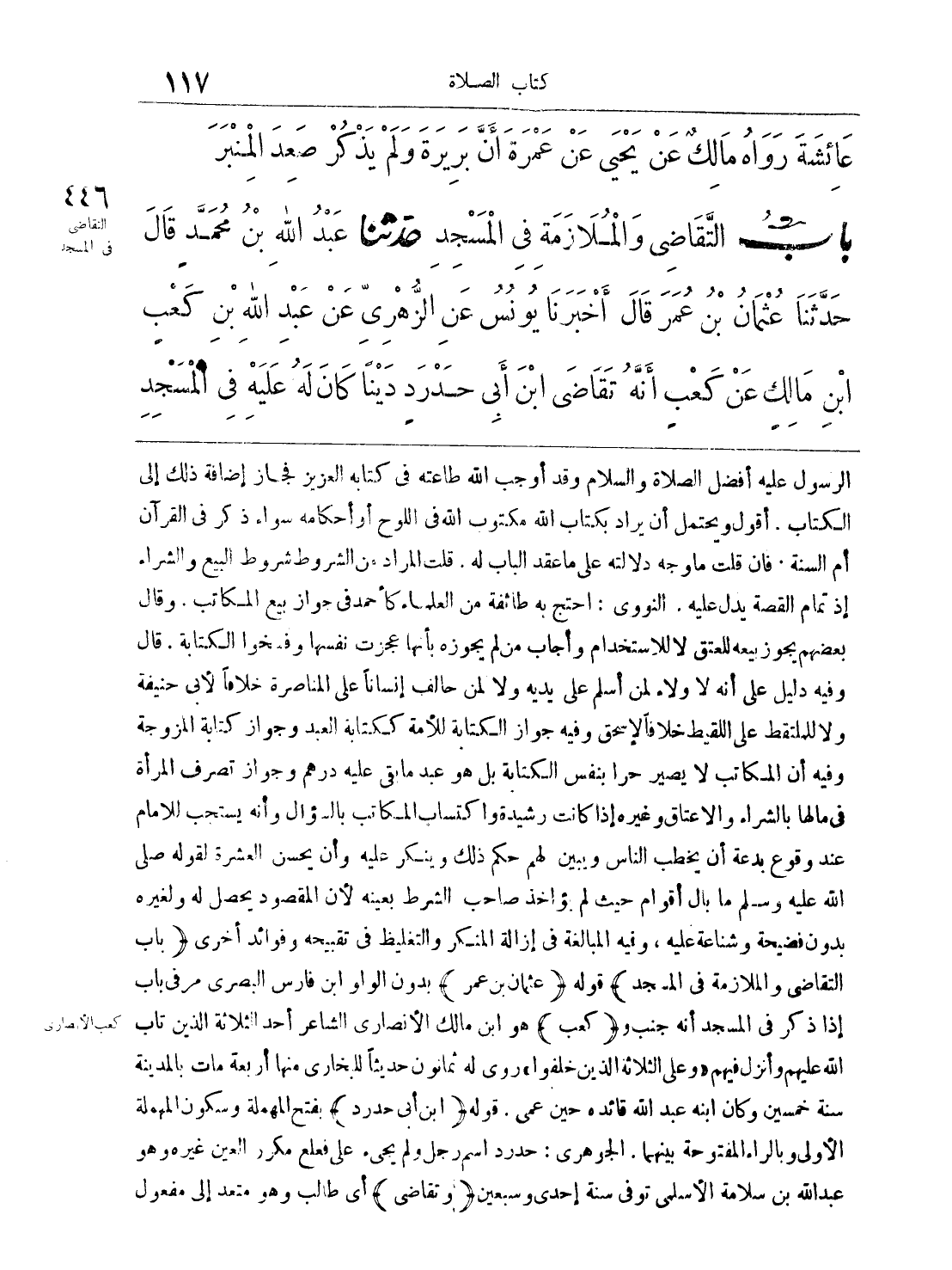 446 - حَدَّثَنَا عَبْدُ اللَّهِ بْنُ مُحَمَّدٍ قَالَ حَدَّثَنَا عُثْمَانُ بْنُ عُمَرَ قَالَ أَخْبَرَنَا يُونُسُ عَنِ الزُّهْرِىِّ عَنْ عَبْدِ اللَّهِ بْنِ كَعْبِ بْنِ مَالِكٍ عَنْ كَعْبٍ أَنَّهُ تَقَاضَى ابْنَ أَبِى حَدْرَدٍ دَيْناً كَانَ لَهُ عَلَيْهِ فِى الْمَسْجِدِ