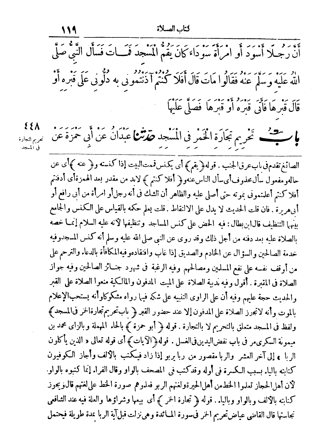 الصائغ تقدم في باب عرق الجنب. قوله (يقم) أي يكنس قممت البيت إذا كنسته و (عنه) أي عن حاله ومفعول سأل محذوف أي سأل الناس عنه و (أفلا كنتم) لابد من مقدر بعد الهمزة أي أدفنتم أفلا كنتم أعلمتموني بموته حتى أصلي عليه والظاهر أن الشك في أنه رجل أو امرأة من أبي رافع أو أبي هريرة. فإن قلت الحديث لا يدل على الالتقاط. قلت يعلم حكمه بالقياس على الكنس والجامع بينهما التنظيف قال ابن بطال: فيه الحض على كنس المساجد وتنظيفها لأنه عليه السلام إنما خصه بالصلاة عليه بعد دفنه من أجل ذلك وقد روى عن النبي - صلى الله عليه وسلم - أنه كنس المسجد وفيه خدمة الصالحين والسؤال عن الخادم والصديق إذا غاب وافتقاده وفيه المكافأة بالدعاء والترحم على من أوقف نفسه على نفع المسلمين ومصالحهم وفيه الرغبة في شهود جنائزه الصالحين وفيه جواز الصلاة في المقبرة، أقول وفيه ندبية الصلاة على الميت المدفون والمالكية منعوا الصلاة على القبر والحديث حجة عليهم وفيه أن على الراوي التنبيه على شكه فيما رواه مشكوكاً وأنه يستحب الإعلام بالموت وأنه لا تجوز الصلاة على المدفون إلا عند حضور القبر (باب تحريم تجارة الخمر في المسجد) ولفظ في المسجد متعلق بالتحريم لا بالتجارة. قوله (أبو حمزة) بالحاء المهملة وبالزاي محمد بن ميمونة السكري مر في باب نفض اليدين في الغسل. قوله (الآيات) أي قوله تعالى (الذين أكلون الربا) إلى آخر العشر والربا مقصور من ربا يربو إذا زاد فيكتب بالألف وأجاز الكوفيون كتابته بالياء بسبب الكسرة في أوله وقد كتب في المصحف بالواو وقال الفراء إنما كتبوه بالواو، لأن أهل الحجاز تعلموا الخط من أهل الحيرة ولغنهم الربو فعلموهم صورة الخط على لغتهم قال ويجوز كتابته ب الألف وبالواو وبالياء. قوله (تجارة الخمر) أي بيعها وشراؤها والعلة فيه عند الشافعي نجاستها قال القاضي عياض تحريم الخمر في سورة المائدة وهي نزلت قبل آية الربا بمدة طويلة فيحتمل