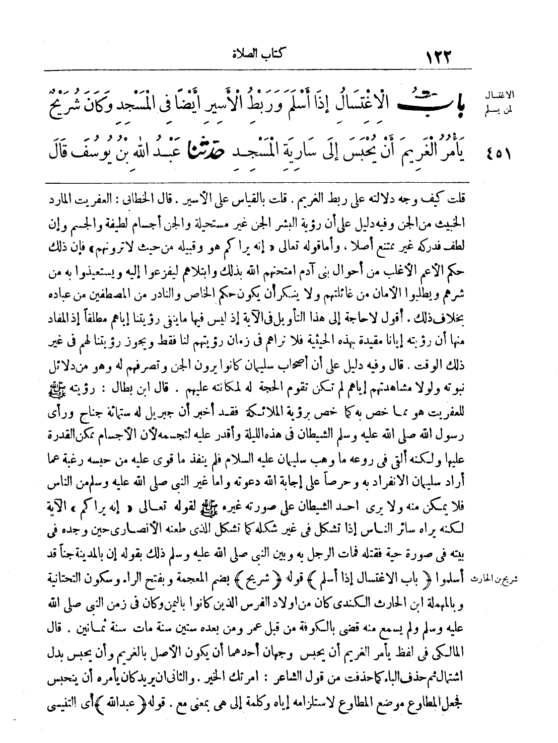 قلت كيف وجه دلالته على ربط الغريم. قلت بالقياس على الأسير. قال الخطابي: العفريت المارد الخبيث من الجن وفيه دليل على أن رؤية البشر الجن غير مستحيلة والجن أجسام لطيفة والجسم وإن لطف فدركه غير ممتنع أصلاً، وأما قوله تعالى (إنه يراكم هو وقبيله من حيث لا ترونهم) فإن ذلك حكم الأعم الأغلب من أحوال بني آدم امتحنهم الله بذلك وابتلاهم ليفزعوا إليه ويستعيذوا به من شرهم ويطلبوا الأمان من غائلتهم ولا ينكر أن يكون حكم الخاص والنادر من المصطفين من عباده بخلاف ذلك. أقول لا حاجة إلى هذا التأويل في الآية إذ ليس فيها ما ينفي رؤيتنا إياهم مطلقاً إذ المفاد منها أن رؤيته إيانا مقيدة بهذه الحيثية فلا نراهم في زمان رؤيتهم لنا فقط ويجوز رؤيتنا لهم في غير ذلك الوقت. قال وفيه دليل على أن أصحاب سليمان كانوا يرون الجن وتصرفهم له وهو من دلائل نبوته ولولا مشاهدتهم إياهم لم تكن تقوم الحجة له لمكانته عليهم. قال ابن بطال: رؤيته - صلى الله عليه وسلم - للعفريت هو مما خص به كما خص برؤية الملائكة فقد أخبر أن جبريل له ستمائة جناح ورأى رسول الله - صلى الله عليه وسلم - في هذه الليلة وأقدر عليه لتجسمه لأن الأجسام ممكن القدرة عليها ولكنه ألقى في روعه ما وهب سليمان عليه السلام فلم ينفذ ما قوى عليه من حبسه رغبة عما أراد سليمان الانفراد به وحرصاً على إجابة الله دعوته وأما غير النبي - صلى الله عليه وسلم - من الناس فلا يمكن منه ولا يرى أحد الشيطان على صورته غيره - صلى الله عليه وسلم - لقوله تعالى (إنه يراكم) الآية لكنه يراه سائر الناس إذا تشكل في غير شكله كما تشكل الذي طعنه الأنصاري حين وجده في بيته في صورة حية فقتله فمات الرجل به وبين النبي - صلى الله عليه وسلم - ذلك بقوله إن بالمدينة جناً قد أسلموا (باب الاغتسال إذا أسلم) قوله (شريح) بضم المعجمة وبفتح الراء وسكون التحتانية وبالمهملة ابن الحارث الكندي كان من أولاد الفرس الذين كانوا باليمن وكان في زمن النبي - صلى الله عليه وسلم - ولم يسمع منه قضى بالكوفة من قبل عمر ومن بعده ستين سنة مات سنة ثمانين. قال المالكي في لفظ يأمر الغريم أن يحبس وجهان أحدهما أن يكون الأصل بالغريم وأن يحبس بدل اشتمال ثم حذف الباء كما حذفت من قول الشاعر: أمرتك بالخير. والثاني أن يريد كان يأمره أن ينحبس فجعل المطاوع موضع المطاوع لاستلزامه إياه وكلمة إلى هي بمعنى مع. قوله (عبد الله) أي التنيسي