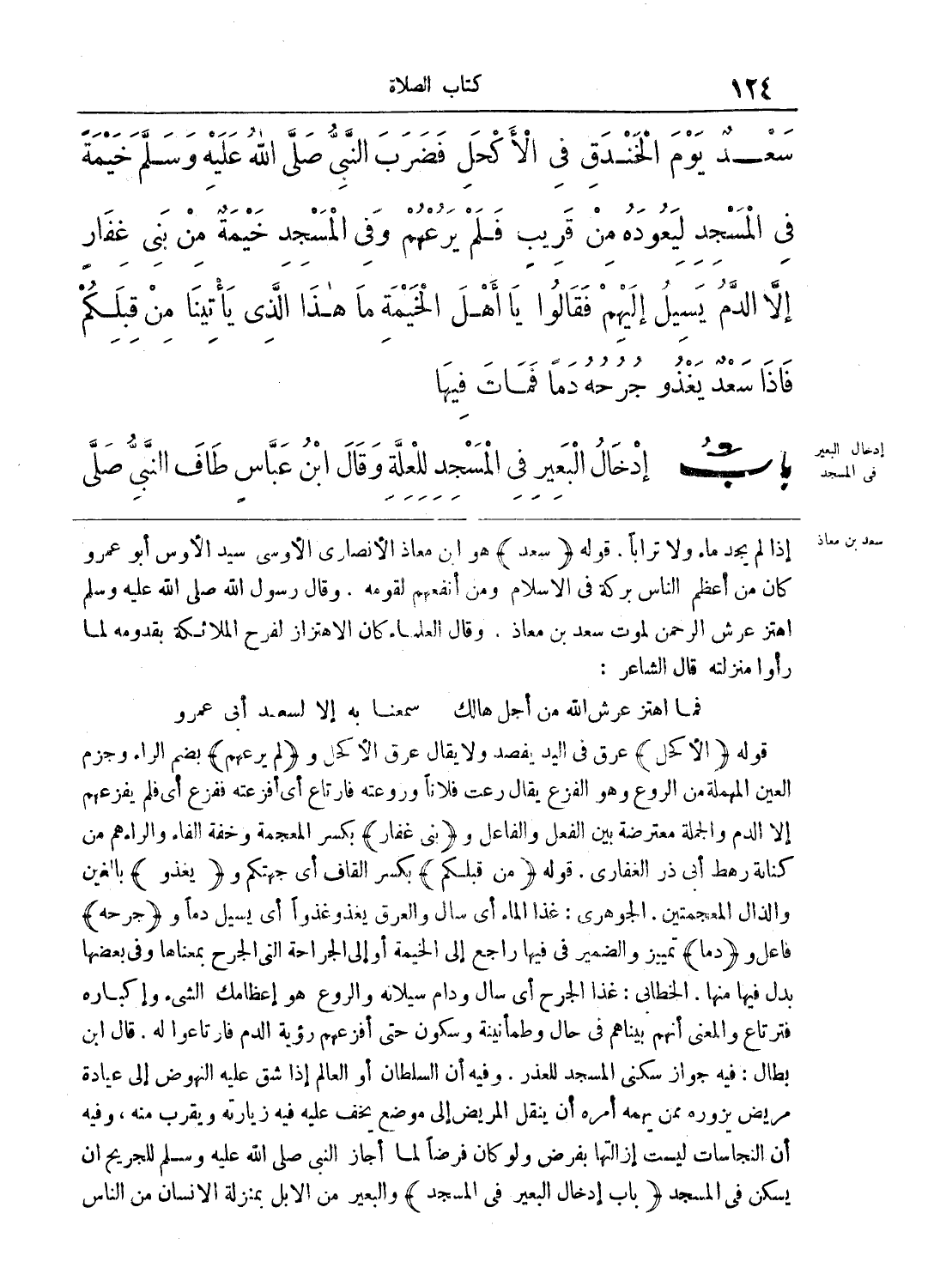 قوله (الأكحل) عرق في اليد يفصد ولا يقال عرق الأكحل و (لم يرعهم) بضم الراء وجزم العين المهملة من الروع وهو الفزع يقال رعت فلاناً وروعته فارتاع أي أفزعته ففزع أي فلم يفزعهم إلا الدم والجملة معترضة بين الفعل والفاعل و (في غفار) بكسر المعجمة وخفة الفاء والراء هم من كناية رهط أبي ذر الغفاري، قوله (من قبلكم) بكسر القاف أي جهتكم و (يغذو) بالغين والذال المعجمتين. الجوهري: إذا الماء أي سال والعرق يغذو غذواً أي يسيل دماً و (جرحه) فاعل و (دماً) تمييز والضمير في فيها راجع إلى الخيمة أو إلى الجراحة التي الجراح بمعناها وفي بعضها بدل فيها منها. الخطابي: إذا الجرح أي سال ودام سيلانه والروع هو إعظامك الشئ وإكباره فترتاع والمعنى أنهم بيناهم في حال وطمأنينة وسكون حتى أفزعهم رؤية الدم فارتاعوا له. قال ابن بطال: فيه جواز سكنى المسجد للعذر. وفيه أن السلطان أو العالم إ ذا شق عليه النهوض إلى عيادة مريض يزوره ممن يهمه أمره أن ينقل المريض ولو كان فرضاً لما أجاز النبي - صلى الله عليه وسلم - للجريح أن يسكن في المسجد (باب إدخال البعير في المسجد) والبعير من الإبل بمنزلة الإنسان من الناس