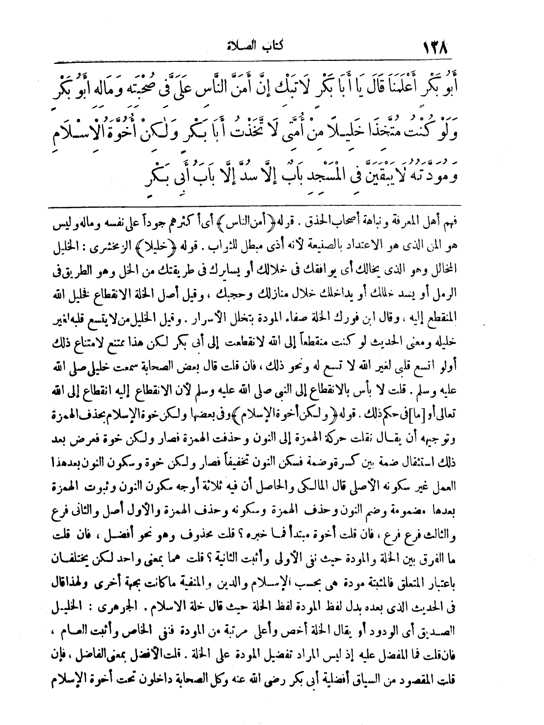 فهم أهل المعرفة ونباهة أصحاب الحذق. قوله (أمن الناس) أي أكثرهم جوداً على نفسه وماله وليس هو المن الذي هو الاعتداد بالصنيعة لأنه أذى مبطل للثواب. قوله (خليلاً) الزمخشري: الخليل المخالل وهو الذي يخالك أي يوافقك في خلالك أو يسايرك في طريقتك من الخل وهو الطريق في الرمل أو يسد خللك أو يداخلك خلال منازلك وحجبك، وقيل أصل الخلة الانقطاع فخليل الله المنقطع إليه، وقال ابن فورك الخلة صفاء المودة بتخلل الأسرار، وقيل الخليل من لا يتسع قلبه لغير خليله ومعنى الحديث لو كنت منقطعاً إلى الله لانقطعت إلى أبي بكر لكن هذا ممتنع لامتناع ذلك أو لو اتسع قلبي لغير الله لاتسع له ونحو ذلك، فإن قلت قال بعض الصحابة سمعت خليلي - صلى الله عليه وسلم -. قلت لا بأس بالانقطاع إلى النبي - صلى الله عليه وسلم - لأن الانقطاع إليه انقطاع إلى الله تعالى أو [ما] في حكم ذلك. قوله (ولكن أخوة الإسلام) وفي بعضها ولكن خوة الإسلام بحذف الهمزة وتوجيهه أن يقال نقلت حركة الهمزة إلى النون وحذفت الهمزة فصار ولكن خوة فعرض بعد ذلك استثقال ضمة بين كسرة وضمة فسكن النون تخفيفاً فصار ولكن خوة وسكون النون بعد هذا العمل غير سكونه الأصلي قال المالكي والحاصل أن فيه ثلاثة أوجه سكون النون وثبوت الهمزة بعدها مضمومة وضم النون وحذف الهمزة وسكونه وحذف الهمزة والأول أصل والثاني فرع والثالث فرع فرع، فإن قلت أخوة مبتدأ فما خبره؟ قلت محذوف وهو نحو أفضل، فإن قلت ما الفرق بين الخلة والمودة حيث نفى الأولى وأثبت الثانية؟ قلت هما بمعنى واحد لكن يختلفان باعتبار المتعلق فالمثبتة مودة هي بحسب الإسلام والدين والمنفية ما كانت بجهة أخرى ولهذا قال في الحديث الذي بعده بدل لفظ المودة لفظ الخلة حيث قال خلة الإسلام. الجوهري: الخليل الصديق أي الودود أو يقال الخلة أخص وأعلى مرتبة من المودة فنفى الخاص وأثبت العام، فإن قلت فما المفضل عليه إذ ليس المراد تفضيل المودة على الخلة. قلت الأفضل بمعنى الفاضل، فإن قلت المقصود من السياق أفضلية أبي بكر رضي الله عنه وكل الصحابة داخلون تحت أخوة الإسلام