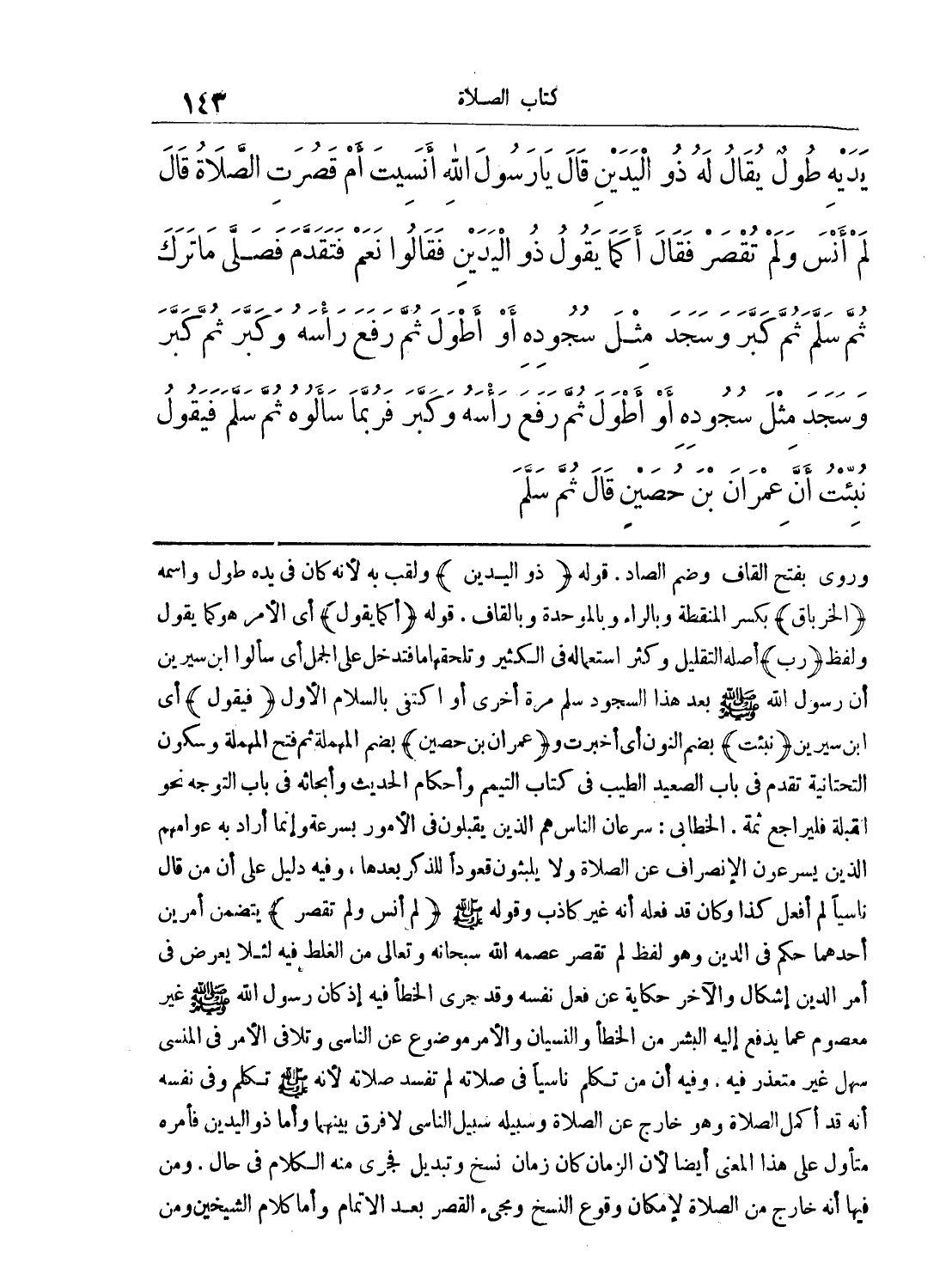يَدَيْهِ طُولٌ يُقَالُ لَهُ ذُو الْيَدَيْنِ قَالَ يَا رَسُولَ اللَّهِ، أَنَسِيتَ أَمْ قَصُرَتِ الصَّلاَةُ قَالَ «لَمْ أَنْسَ، وَلَمْ تُقْصَرْ». فَقَالَ «أَكَمَا يَقُولُ ذُو الْيَدَيْنِ». فَقَالُوا نَعَمْ. فَتَقَدَّمَ فَصَلَّى مَا تَرَكَ، ثُمَّ سَلَّمَ، ثُمَّ كَبَّرَ وَسَجَدَ مِثْلَ سُجُودِهِ أَوْ أَطْوَلَ، ثُمَّ رَفَعَ رَاسَهُ وَكَبَّرَ، ثُمَّ كَبَّرَ وَسَجَدَ مِثْلَ سُجُودِهِ أَوْ أَطْوَلَ، ثُمَّ رَفَعَ رَاسَهُ وَكَبَّرَ. فَرُبَّمَا سَأَلُوهُ ثُمَّ سَلَّمَ فَيَقُولُ نُبِّئْتُ أَنَّ عِمْرَانَ بْنَ حُصَيْنٍ قَالَ ثُمَّ سَلَّمَ.