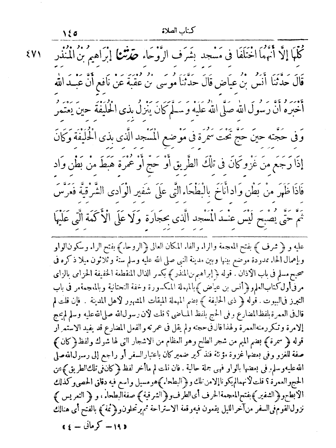 471 - حَدَّثَنَا إِبْرَاهِيمُ بْنُ الْمُنْذِرِ قَالَ حَدَّثَنَا أَنَسُ بْنُ عِيَاضٍ قَالَ حَدَّثَنَا مُوسَى بْنُ عُقْبَةَ عَنْ نَافِعٍ أَنَّ عَبْدَ اللَّهِ أَخْبَرَهُ أَنَّ رَسُولَ اللَّهِ - صلى الله عليه وسلم - كَانَ يَنْزِلُ بِذِى الْحُلَيْفَةِ حِينَ يَعْتَمِرُ، وَفِى حَجَّتِهِ حِينَ حَجَّ، تَحْتَ سَمُرَةٍ فِى مَوْضِعِ الْمَسْجِدِ الَّذِى بِذِى الْحُلَيْفَةِ، وَكَانَ إِذَا رَجَعَ مِنْ غَزْوٍ كَانَ فِى تِلْكَ الطَّرِيقِ أَوْ حَجٍّ أَوْ عُمْرَةٍ هَبَطَ مِنْ بَطْنِ وَادٍ، فَإِذَا ظَهَرَ مِنْ بَطْنِ وَادٍ أَنَاخَ بِالْبَطْحَاءِ الَّتِى عَلَى شَفِيرِ الْوَادِى الشَّرْقِيَّةِ، فَعَرَّسَ ثَمَّ حَتَّى يُصْبِحَ، لَيْسَ عِنْدَ الْمَسْجِدِ الَّذِى بِحِجَارَةٍ، وَلاَ عَلَى الأَكَمَةِ الَّتِى عَلَيْهَا