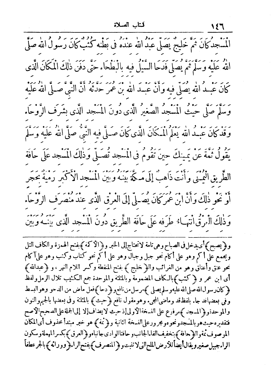 الْمَسْجِدُ، كَانَ ثَمَّ خَلِيجٌ يُصَلِّى عَبْدُ اللَّهِ عِنْدَهُ، فِى بَطْنِهِ كُثُبٌ كَانَ رَسُولُ اللَّهِ - صلى الله عليه وسلم - ثَمَّ يُصَلِّى، فَدَحَا السَّيْلُ فِيهِ بِالْبَطْحَاءِ حَتَّى دَفَنَ ذَلِكَ الْمَكَانَ الَّذِى كَانَ عَبْدُ اللَّهِ يُصَلِّى فِيهِ وَأَنَّ عَبْدَ اللَّهِ بْنَ عُمَرَ حَدَّثَهُ أَنَّ النَّبِىَّ - صلى الله عليه وسلم - صَلَّى حَيْثُ الْمَسْجِدُ الصَّغِيرُ الَّذِى دُونَ الْمَسْجِدِ الَّذِى بِشَرَفِ الرَّوْحَاءِ، وَقَدْ كَانَ عَبْدُ اللَّهِ يَعْلَمُ الْمَكَانَ الَّذِى كَانَ صَلَّى فِيهِ النَّبِىُّ - صلى الله عليه وسلم - يَقُولُ ثَمَّ عَنْ يَمِينِكَ حِينَ تَقُومُ فِى الْمَسْجِدِ تُصَلِّى، وَذَلِكَ الْمَسْجِدُ عَلَى حَافَةِ الطَّرِيقِ الْيُمْنَى، وَأَنْتَ ذَاهِبٌ إِلَى مَكَّةَ، بَيْنَهُ وَبَيْنَ الْمَسْجِدِ الأَكْبَرِ رَمْيَةٌ بِحَجَرٍ أَوْ نَحْوُ ذَلِكَ. وَأَنَّ ابْنَ عُمَرَ كَانَ يُصَلِّى إِلَى الْعِرْقِ الَّذِى عِنْدَ مُنْصَرَفِ الرَّوْحَاءِ، وَذَلِكَ الْعِرْقُ انْتِهَاءُ طَرَفِهِ عَلَى حَافَةِ الطَّرِيقِ، دُونَ الْمَسْجِدِ الَّذِى بَيْنَهُ وَبَيْنَ
