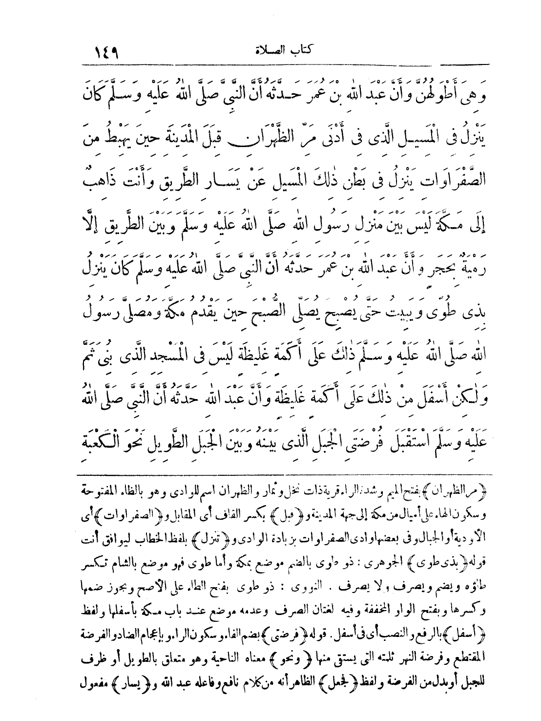 {مر الظهران} بفتح الميم وشد الراء قرية ذات نخل وثمار والظهران اسم للوادي وهو بالظاء المفتوحة وسكون الهاء على أميال من مكة إلى جهة المدينة و {قبل} بكسر القاف أي المقابل و {الصفراوات} أي الأودية أو الجبال وفي بعضها وادي الصفراوات بزيادة الوادي و {تنزل} بلفظ الخطاب ليوافق أنت ... قوله {بذى طوى} الجوهري: ذو طوى بالضم موضع بمكة وأما طوى فهو موضع بالشام تكسر طاؤه ويضم ويصرف ولا يصرف. النووي: ذو طوى بفتح الطاء على الأصح ويجوز ضمها وكسرها وبفتح الواو المخففة وفيه لغتان الصرف وعدمه موضع عند باب مكة بأسفلها ولفظ {أسفل} بالرفع والنصب أي في أسفل. قوله {فرضتى} بضم الفاء وسكون الراء وبإعجام الضاد والفرضة المقتطع وفرضة النهر ثلته التي يستقي منها {ونحو} معناه الناحية وهو متعلق بالطويل أو ظرف للجبل أو بدل من الفرضة ولفظ {فجعل} الظاهر أنه من كلام نافع وفاعله عبد الله و {يسار} مفعول