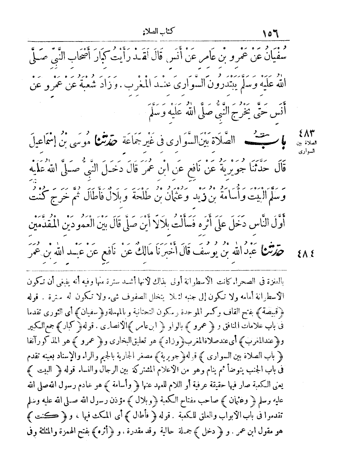 بالعنزة في الصحراء كانت الأسطوانة أولى بذلك لأنها أشد سترة منها وفيه أنه ينبغي أن تكون الأسطوانة أمامه ولا تكون إلى جنبه لئلا يتخلل الصفوف شيء ولا تكون له سترة. قوله {قبيضة} بفتح القاف وكسر الموحدة وسكون التحتانية وبالمهملة و {سفيان} أي الثوري تقدما في باب علامات النافق و {عمرو} بالواو {ابن عامر} الأنصاري. قوله {كبار} جمع الكبير و {عند المغرب} أي عند صلاة المغرب {وزاد} هو تعليق البخاري و {عمرو} هو المذكور آنفا {باب الصلاة بيت السواري} قوله {جويرية} مصغر الجارية بالجيم والراء والإسناد بعينه تقدم في باب الجنب يتوضأ ثم ينام وهو من الأعلام المشتركة بين الرجال والنساء قوله {البيت} يعني الكعبة صار فيها حقيقة عرفية أو اللام للعهد عنها {وأسامة} هو خادم رسول الله صلى الله عليه وسلم {وعثمان} صاحب مفتاح الكعبة {وبلال} مؤذن رسول الله صلى الله عليه وسلم تقدموا في باب الأبواب والغلق للكعبة. قوله {فأطال} أي المكث فيها، و {كنت} هو مقول ابن عمر. و {دخل} جملة حالية وقد مقدرة، و {أثره} بفتح الهمزة والمثلثة وفي