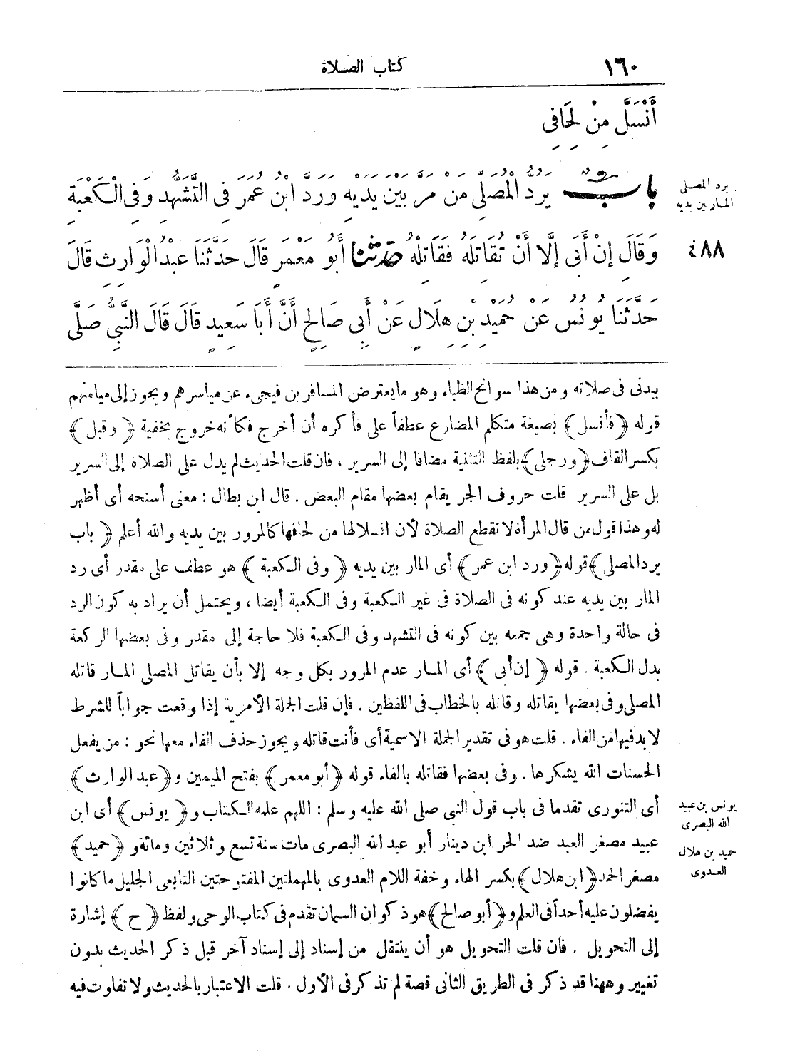 ببدني في صلاته ومن هذا سوانح الظباء وهو ما يعترض المسافرين فيجيء عن مياسرهم ويجوز إلى ميامنهم قوله {فأنسل} بصيغة متكلم المضارع عطفا على فأكره أن أخرج فكأنه خروج بخفية {وقيل} بكسر القاف {ورجلي} بلفظ التثنية مضافا إلى السرير، فإن قلت الحديث لم يدل الحديث على الصلاة إلى السرير بل على السرير قلت حروف الجر يقام بعضها مقام البعض. قال ابن بطال: معنى أسنحة أي أظهر له وهذا قول من قال المرأة لا تقطع الصلاة لأن انسلالها من لحافها كالمرور بين يديه والله أعلم {باب يرد المصلى} قوله {ورد ابن عمر} أي المار بين يديه {وفي الكعبة} هو عطف على مقدر أي رد المار بين يديه عند كونه في الصلاة في غير الكعبة وفي الكعبة أيضا، ويحتمل أن يراد به كون الرد في حالة وهي جمعه بين كونه في التشهد وفي الكعبة فلا حاجة إلى مقدر وفي بعضها الركعة بدل الكعبة. قوله {إن أبى} أي المار عدم المرور بكل وجه إلا بأن يقاتل المصلى المار قاتله المصلى وفي بعضها يقاتله وقاتله بالخطاب في اللفظين. فإن قلت الجملة الأمرية إذا وقعت جوابا للشرط لابد فيها من الفاء. قلت هو في تقدير الجملة الاسمية أي فأنت قاتله ويجوز حذف الفاء معها نحو: من يفعل الحسنات الله يشكرها. وفي بعضها فقاتله بالفاء قوله {أبو معمر} بفتح الميمين و {عبد الوارث} أي التنوري تقدما في باب قول النبي صلى الله عليه وسلم: اللهم علمه الكتاب و {يونس} أي ابن عبيد مصغر العبد ضد الحر ابن دينار أبو عبد الله البصري مات سنة تسع وثلاثين ومائة و {حميد} مصغر الحمد {ابن هلال} بكسر الهاء وخفة اللام العدوي بالمهملتين المفتوحتين التابعي الجليل ما كانوا يفضلون عليه أحدا في العلم و {أبو صالح} هو ذكوان السمان تقدم في باب الوحي ولفظ {ح} إشارة إلى التحويل، فإن قلت التحويل هو أن ينتقل من إسناد إلى إسناد آخر قبل ذكر الحديث بدون تغيير وههنا قد ذكر في الطريق الثاني قصة لم تذكر في الأول. قلت الاعتبار بالحديث ولا تفاوت فيه