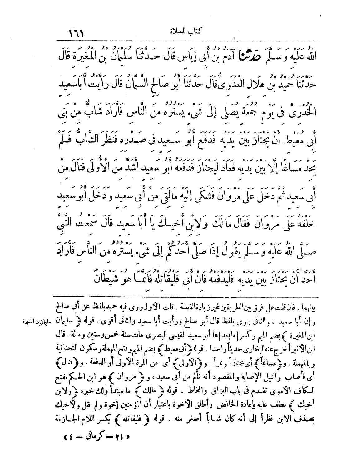 الله عليه وسلم - وَحَدَّثَنَا آدَمُ بْنُ أَبِى إِيَاسٍ قَالَ حَدَّثَنَا سُلَيْمَانُ بْنُ الْمُغِيرَةِ قَالَ حَدَّثَنَا حُمَيْدُ بْنُ هِلاَلٍ الْعَدَوِىُّ قَالَ حَدَّثَنَا أَبُو صَالِحٍ السَّمَّانُ قَالَ رَأَيْتُ أَبَا سَعِيدٍ الْخُدْرِىَّ فِى يَوْمِ جُمُعَةٍ يُصَلِّى إِلَى شَىْءٍ يَسْتُرُهُ مِنَ النَّاسِ، فَأَرَادَ شَابٌّ مِنْ بَنِى أَبِى مُعَيْطٍ أَنْ يَجْتَازَ بَيْنَ يَدَيْهِ فَدَفَعَ أَبُو سَعِيدٍ فِى صَدْرِهِ، فَنَظَرَ الشَّابُّ فَلَمْ يَجِدْ مَسَاغاً إِلاَّ بَيْنَ يَدَيْهِ، فَعَادَ لِيَجْتَازَ فَدَفَعَهُ أَبُو سَعِيدٍ أَشَدَّ مِنَ الأُولَى، فَنَالَ مِنْ أَبِى سَعِيدٍ، ثُمَّ دَخَلَ عَلَى مَرْوَانَ فَشَكَا إِلَيْهِ مَا لَقِىَ مِنْ أَبِى سَعِيدٍ، وَدَخَلَ أَبُو سَعِيدٍ خَلْفَهُ عَلَى مَرْوَانَ فَقَالَ مَا لَكَ وَلاِبْنِ أَخِيكَ يَا أَبَا سَعِيدٍ قَالَ سَمِعْتُ النَّبِىَّ - صلى الله عليه وسلم - يَقُولُ «إِذَا صَلَّى أَحَدُكُمْ إِلَى شَىْءٍ يَسْتُرُهُ مِنَ النَّاسِ، فَأَرَادَ أَحَدٌ أَنْ يَجْتَازَ بَيْنَ يَدَيْهِ فَلْيَدْفَعْهُ، فَإِنْ أَبَى فَلْيُقَاتِلْهُ، فَإِنَّمَا هُوَ شَيْطَانٌ»