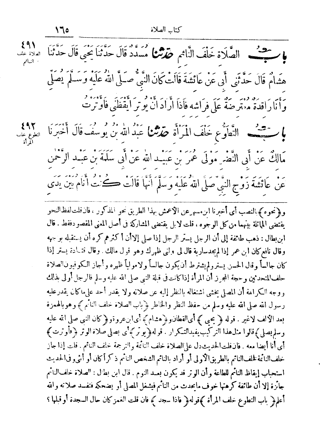 492 - حَدَّثَنَا عَبْدُ اللَّهِ بْنُ يُوسُفَ قَالَ أَخْبَرَنَا مَالِكٌ عَنْ أَبِى النَّضْرِ مَوْلَى عُمَرَ بْنِ عُبَيْدِ اللَّهِ عَنْ أَبِى سَلَمَةَ بْنِ عَبْدِ الرَّحْمَنِ عَنْ عَائِشَةَ زَوْجِ النَّبِىِّ - صلى الله عليه وسلم - أَنَّهَا قَالَتْ كُنْتُ أَنَامُ بَيْنَ يَدَيْ