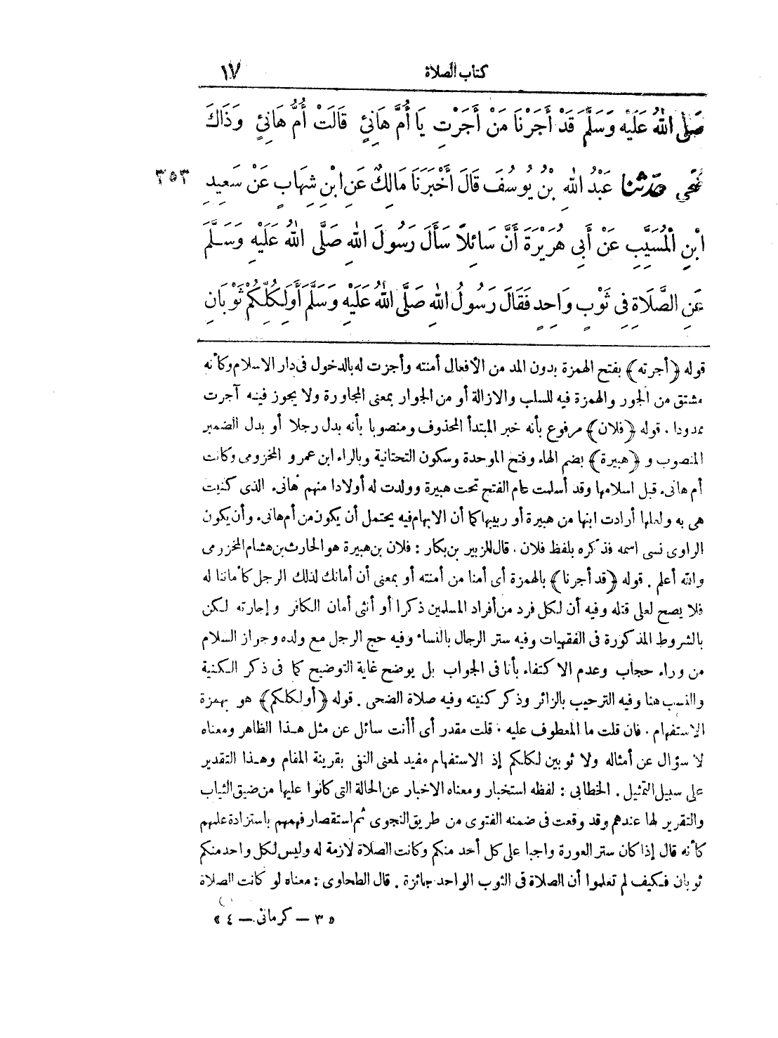 قوله (أجرته) بفتح الهمزة بدون المد من الأفعال أمنته وأجزت له بالدخول في دار الإسلام وكأنه مشتق من الجور والهمزة فيه للسلب والإزالة أو من الجوار بمعنى المجاورة ولا يجوز فيه آجرت ممدوداً. قوله (فلان) مرفوع بأنه خبر المبتدأ المحذوف ومنصوباً بأنه بدل رجلاً أو بدل الضمير المنصوب و (هبيرة) بضم الهاء وفتح الموحدة وسكون التحتانية وبالراء ابن عمرو المخزومي وكانت أم هانئ قبل إسلامها وقد أسلمت عام الفتح تحت هبيرة وولدت له أولاداً منهم هانئ الذي كُنيت هي به ولعلها أرادت ابنها من هبيرة أو ربيبها كما أن الإبهام فيه يحتمل أن يكون من أهم هانئ. وأن يكون الراوي نسي اسمه فذكره بلفظ فلان. قال الزبير بن بكار: فلان بن هبيرة هو الحارث بن هشام المخزومي والله أعلم. قوله (قد أجرنا) بالهمزة أي أمنا من أمنته أو بمعنى أن أمانك لذلك الرجل كأماننا له فلا يصح لعلي قتله وفيه أن لكل فرد من أفراد المسلمين ذكراً أو أنثى أمان الكافر وإجارته لكن بالشروط المذكورة في الفقيهات وفي ستر الرجال بالنسبة وفيه حج الرجل مع ولده وجواز السلام من وراء حجاب وعدم الاكتفاء بأنا في الجواب بل يوضح غاية التوضيح كما في ذكر الكنية والنسب هنا وفيه الترحيب بالزائر وذكر كنيته وفيه صلاة الضحى. قوله (أولكلكم) هو بهمزة الاستفهام. فإن قلت ما المعطوف عليه. قلت مقدر أي أأنت سائل عن مثل هذا الظاهر ومعناه لا سؤال عن أمثاله ولا ثوبين لكلكم إذ الاستفهام مفيد لمعنى النفي بقرينة المقام وهذا التقدير على سبيل التمثيل. الخطابي: لفظه استخبار ومعناه الإخبار عن الحالة التي كانوا عليها من ضيق الثياب والتقرير لهم عندهم وقد وقفت في ضمنه الفتوى من طريق النجوى ثم استقصار فهمهم باستزادة علمهم كأنه قال إذا كان ستر العورة واجباً على كل أحد منكم وكانت الصلاة لازمة له وليس لكل واحد منكم ثوبان فكيف لم تعلموا أن الصلاة في الثوب الواحد جائزة. قال الطحاوي: معناه لو كانت الصلاة