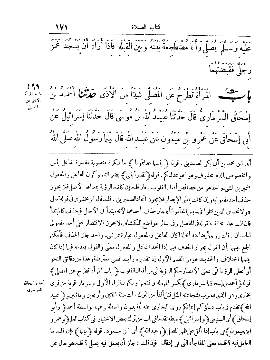 أى ابن محمد بن ابى بكر الصديق , قوله (بئسما عدلتمونا) ما نكرة منصوبة لفاعل بئس والمخصوص بالذم محذوف وهو نحو عدلكم. قوله (لقد رأيتنى) بضم التاء وكون الفاعل والمفعول ضميرين لشىء واحد هو من خصائص افعال القلوب. فإن قلت إن كانت الرؤية بمعناها الأصلى فلا يجوز حذف أحد مفعوليه وإن كانت بمعنى الإبصار فلا يجوز اتحاد الضميرين. قلت قال الزمخشرى فى قوله تعالى ((ولا تحسبن الذين قتلوا فى سبيل الله أمواتا)) جاز حذف أحدهما لأنه مبتدأ فى الأصل فيحذف كالمبتدأ فإن قلت هذا مخالف لقوله فى المفصل وفى سائر مواضع الكشاف لا يجوز الاقتصار على احد مفعولى الحسبان. قلت روى أيضا عنه انه إذا كان الفاعل والمفعول عبارة عن شىء واحد جاز الحذف فأمكن الجمع بينهما بأن القول بجواز الحذف فيما إذا اتحد الفاعل والمفعول معنى والقول بعدمه وهذا من دقائق النحو بينهما اختلاف والحديث هو من القسم الأول إذ تقديره رأيت نفسى معترضة وهذا من دقائق النحو أو أعطى للرؤية التى بمعنى الابصار حكم الرؤية التى من افعال القلوب (باب المرأة تطرح عن المصلى) قوله (أحمد بن إسحاق السرمارى) بكسر المهملة وبفتحها وسكون الراء الأولى وسرمار قرية من قرى بخارى وهو الذى يضرب بشجاعته المثل قتل ألفا من الترك مات سنة اثنتين وأربعين ومائتين و (عبيد الله) تقدم فى باب دعاؤكم إيمانكم روى البخارى عنه ثمة بدون واسطة وههنا بواسطة احمد (وأبو إسحاق) أى السبيعى (وإسرائيل) سبطه تقدما فى باب من ترك بعض الاختيار فى كتاب العلم (وعمرو ابن ميمون) فى باب إذا ألقى على ظهر المصلى (وعبد الله) أى ابن مسعود. قوله (بينما) فإن قلت العامل فيه؟ قلت معنى المفاجاة التى فى إذ قال. فإن قلت: جاز أن يعمل فيه يصلى؟ قلت هو حال عن