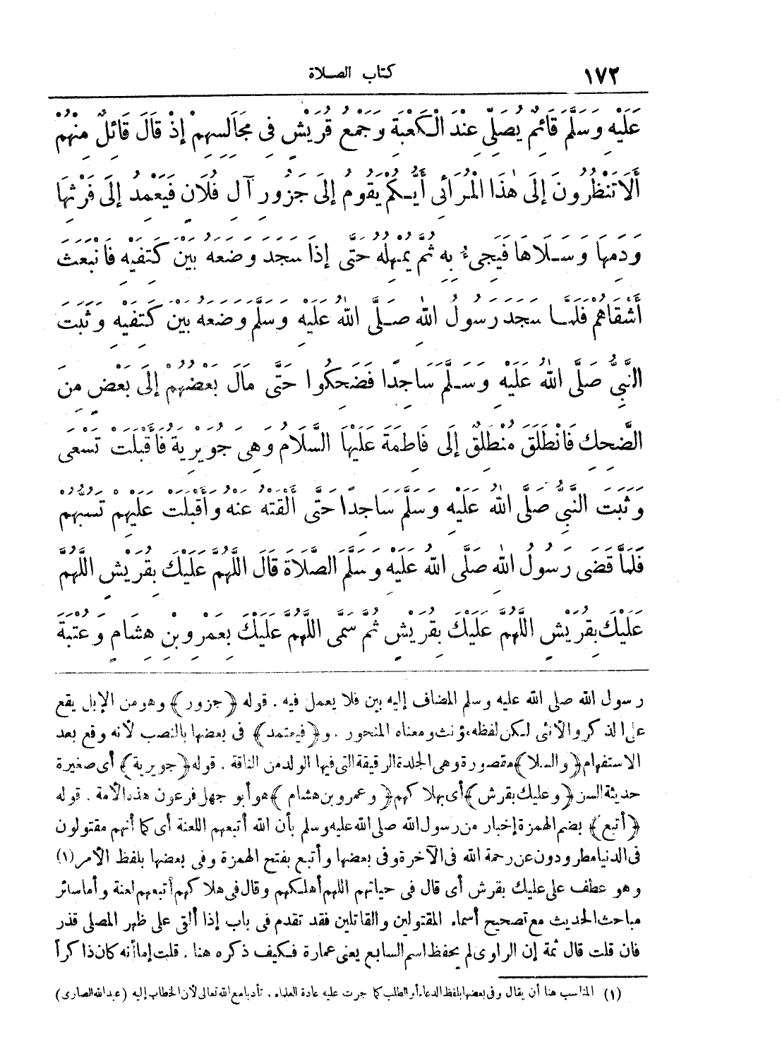 عليه وسلم - قَائِمٌ يُصَلِّى عِنْدَ الْكَعْبَةِ، وَجَمْعُ قُرَيْشٍ فِى مَجَالِسِهِمْ إِذْ قَالَ قَائِلٌ مِنْهُمْ أَلاَ تَنْظُرُونَ إِلَى هَذَا الْمُرَائِى أَيُّكُمْ يَقُومُ إِلَى جَزُورِ آلِ فُلاَنٍ، فَيَعْمِدُ إِلَى فَرْثِهَا وَدَمِهَا وَسَلاَهَا فَيَجِىءُ بِهِ، ثُمَّ يُمْهِلُهُ حَتَّى إِذَا سَجَدَ وَضَعَهُ بَيْنَ كَتِفَيْهِ فَانْبَعَثَ أَشْقَاهُمْ، فَلَمَّا سَجَدَ رَسُولُ اللَّهِ - صلى الله عليه وسلم - وَضَعَهُ بَيْنَ كَتِفَيْهِ، وَثَبَتَ النَّبِىُّ - صلى الله عليه وسلم - سَاجِدًا، فَضَحِكُوا حَتَّى مَالَ بَعْضُهُمْ إِلَى بَعْضٍ مِنَ الضَّحِكِ، فَانْطَلَقَ مُنْطَلِقٌ إِلَى فَاطِمَةَ - عَلَيْهَا السَّلاَمُ - وَهْىَ جُوَيْرِيَةٌ، فَأَقْبَلَتْ تَسْعَى وَثَبَتَ النَّبِىُّ - صلى الله عليه وسلم - سَاجِدًا حَتَّى أَلْقَتْهُ عَنْهُ، وَأَقْبَلَتْ عَلَيْهِمْ تَسُبُّهُمْ، فَلَمَّا قَضَى رَسُولُ اللَّهِ - صلى الله عليه وسلم - الصَّلاَةَ قَالَ «اللَّهُمَّ عَلَيْكَ بِقُرَيْشٍ، اللَّهُمَّ عَلَيْكَ بِقُرَيْشٍ، اللَّهُمَّ عَلَيْكَ بِقُرَيْشٍ - ثُمَّ سَمَّى - اللَّهُمَّ عَلَيْكَ بِعَمْرِو بْنِ هِشَامٍ، وَعُتْبَةَ