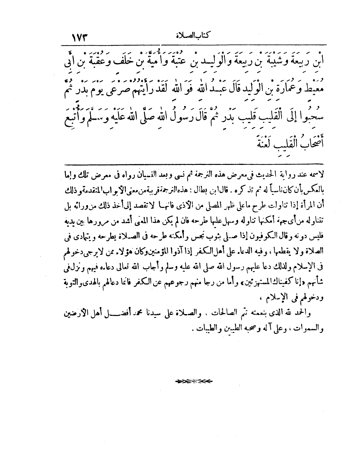 لاسمه عند رواية الحديث فى معرض هذه الترجمة ثم نسى وبعد النسيان رواه فى معرض تلك وإما بالعكس بأن كان ناسيا له ثم تذكره. قال ابن بطال: هذه الترجمة قريبة من معنى الأبواب المتقدمة وذلك أن المراة إذا تناولت طرح ما على ظهر المصلى من الأذى فأنها لا تقصد إلى أخذ ذلك من ورائه بل تتناوله من اى جهة أمكنها تناوله وسهل عليها طرحه فأن لم يكن هذا المعنى أشد من مرورها بين يديه فليس دونه وقال الكوفيون إذا صلى بثوب نجس وامكنه طرحه فى الصلاة يطرحه ويتمادى فى الصلاة ولا يقطعها , وفيه الدعاء على أهل الكفر إذا آذوا المؤمنين وكان هؤلاء ممن لا يرجى دخولهم فى الاسلام ولذلك دعا عليهم رسول الله صلى الله عليه وسلم واجاب الله تعالى دعاءه فيهم ونزل فى شأنهم ((إنا كفيناك المستهزئين)) وأما من رجا منهم رجوعهم عن الكفر فأنما دعا لهم بالهدى والتوبة ودخولهم فى الإسلام , ... والحمد لله الذى بنعمته تتم الصالحات , والصلاة على سيدنا محمد أفضل أهل الأرضين والسموات , وعلى آله وصحبه الطيبين والطيبات.