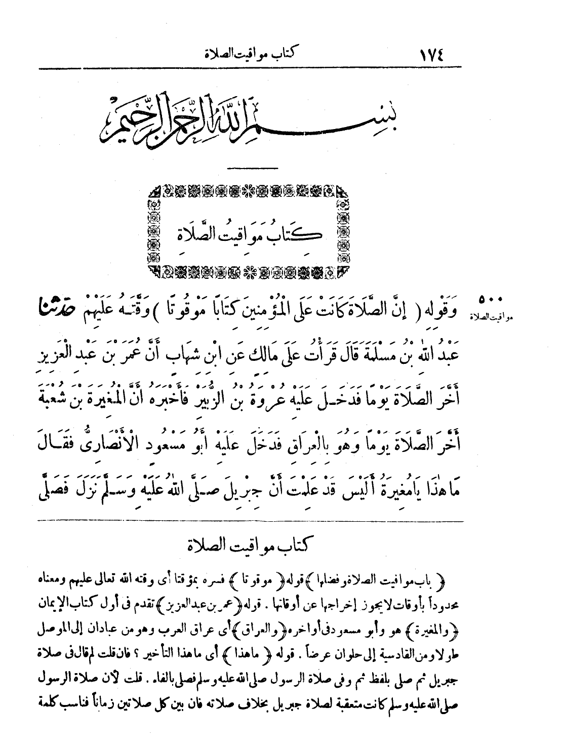 (باب مواقيت الصلاة وفضلها) قوله (موقوتا) فسره بمؤقتا أى وقته الله تعالى عليهم ومعناه محدودا بأوقات لا يجوز إخراجها عن أوقاتها. قوله (عمر بن عبد العزيز) تقدم فى أول كتاب الإيمان (والمغيرة) هو وأبو مسعود فى أواخره (والعراق) أى عراق العرب وهو من عبادان إلى الموصل طولا ومن القادسية إلى حلوان عرضا. قوله (ما هذا) أى ما هذا التأخير. فإن قلت لم قال فى صلاة جبريل ثم صلى بلفظ ثم وفى صلاة الرسول صلى الله عليه وسلم فصلى بالفاء. قلت لأن صلاة الرسول صلى الله عليه وسلم كانت متعقبة لصلاة جبريل بخلاف صلاته فإن كل صلاتين زمانا فناسب كلمة