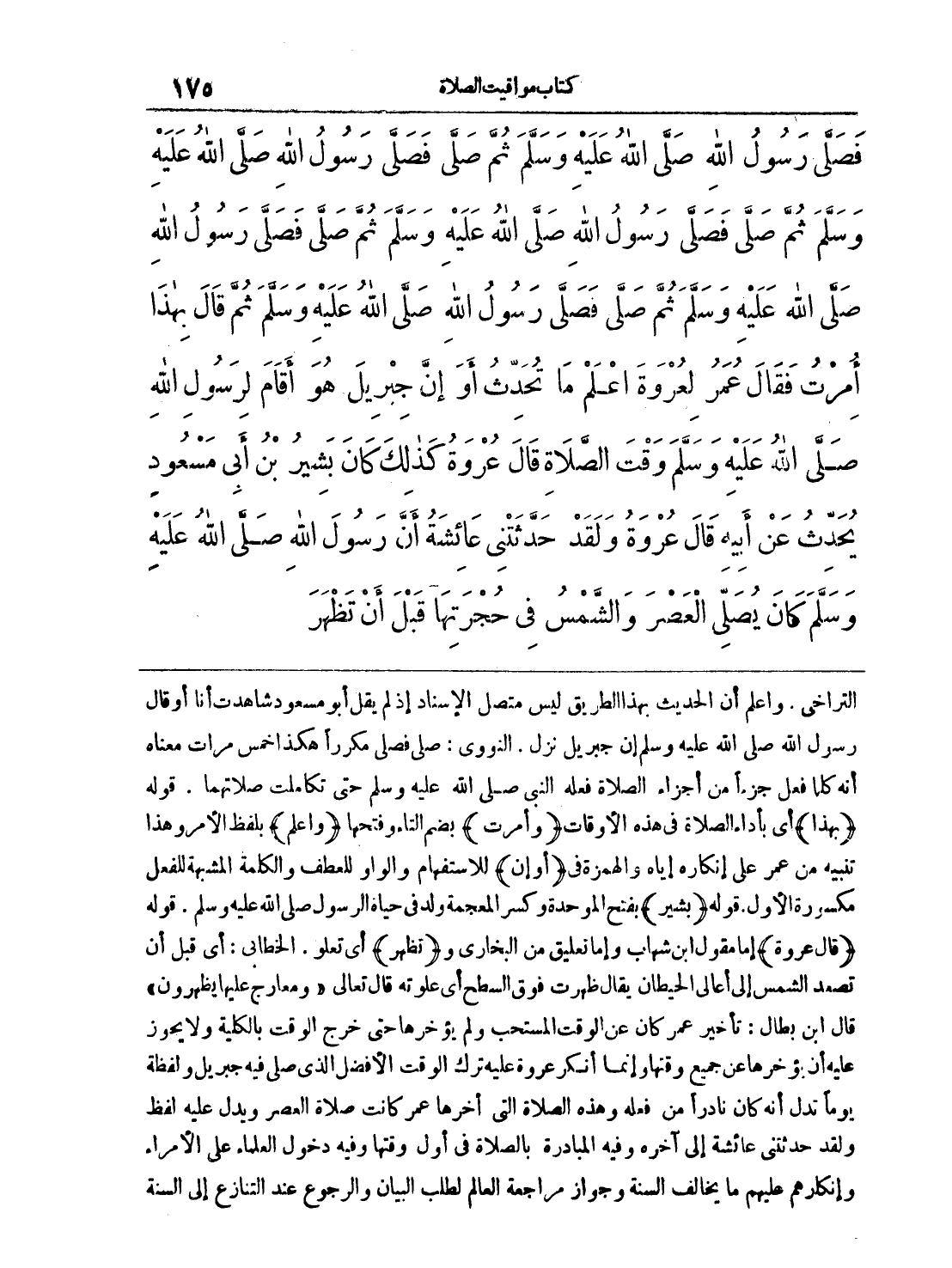 التراخى. واعلم أن الحديث بهذا الطريق ليس متصل الإسناد إذ لم يقل أبو مسعود شاهدت أنا أو قال رسول الله صلى الله عليه وسلم إن جبريل نزل. النووى: صلى فصلى مكررا هكذا خمس مرات معناه أنه كلما فعل جزءا من أجزاء الصلاة فعله النبى صلى الله عليه وسلم حتى تكاملت صلاتهما. قوله (بهذا) أى بأداء الصلاة فى هذه الأوقات (وأمرت) بضم التاء وفتحها (واعلم) بلفظ الأمر وهذا تنبيه من عمر على إنكاره إياه والهمزة فى (أو إن) للاستفهام والواو للعطف والكلمة المشبهة للفعل مكسورة الأول. قوله (بشير) بفتح الموحدة وكسر المعجمة ولد فى حياة الرسول صلى الله عليه وسلم. قوله (قال عروة) إما مقول ابن شهاب وإما تعليق من البخارى و (تظهر) أى تعلو. الخطابى: أى قبل أن تصعد الشمس إلى أعالى الحيطان يقال ظهرت فوق السطح أى علوته قال تعالى ((ومعارج عليها يظهرون)) قال ابن بطال: تأخير عمر كان عن الوقت المستحب ولم يؤخرها حتى خرج الوقت بالكلية ولا يجوز عليه أن يؤخرها عن جميع وقتها وإنما أنكر عروة عليه ترك الوقت الأفضل الذى صلى فيه جبريل ولفظة يوما تدل أنه كان نادرا من فعله وهذه الصلاة التى أخرها عمر كانت صلاة العصر ويدل عليه لفظ ولقد حدثتني عائشة إلى آخره وفيه المبادرة بالصلاة فى أول وقتها وفيه دخول العلماء على الأمراء وإنكارهم عليهم ما يخالف السنة وجواز مراجعة العلم لطلب البيان والرجوع عند التنازع إلى السنة
