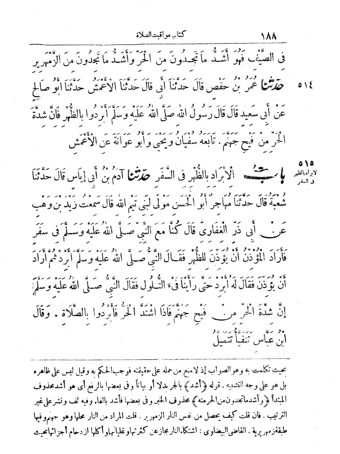 515 - حَدَّثَنَا آدَمُ بْنُ أَبِى إِيَاسٍ قَالَ حَدَّثَنَا شُعْبَةُ قَالَ حَدَّثَنَا مُهَاجِرٌ أَبُو الْحَسَنِ مَوْلًى لِبَنِى تَيْمِ اللَّهِ قَالَ سَمِعْتُ زَيْدَ بْنَ وَهْبٍ عَنْ أَبِى ذَرٍّ الْغِفَارِىِّ قَالَ كُنَّا مَعَ النَّبِىِّ صلى الله عليه وسلم فِى سَفَرٍ، فَأَرَادَ الْمُؤَذِّنُ أَنْ يُؤَذِّنَ لِلظُّهْرِ فَقَالَ النَّبِىُّ - صلى الله عليه وسلم - «أَبْرِدْ». ثُمَّ أَرَادَ أَنْ يُؤَذِّنَ فَقَالَ لَهُ «أَبْرِدْ». حَتَّى رَأَيْنَا فَىْءَ التُّلُولِ، فَقَالَ النَّبِىُّ - صلى الله عليه وسلم - «إِنَّ شِدَّةَ الْحَرِّ مِنْ فَيْحِ جَهَنَّمَ، فَإِذَا اشْتَدَّ الْحَرُّ فَأَبْرِدُوا بِالصَّلاَةِ». وَقَالَ ابْنُ عَبَّاسٍ تَتَفَيَّأُ تَتَمَيَّلُ.
