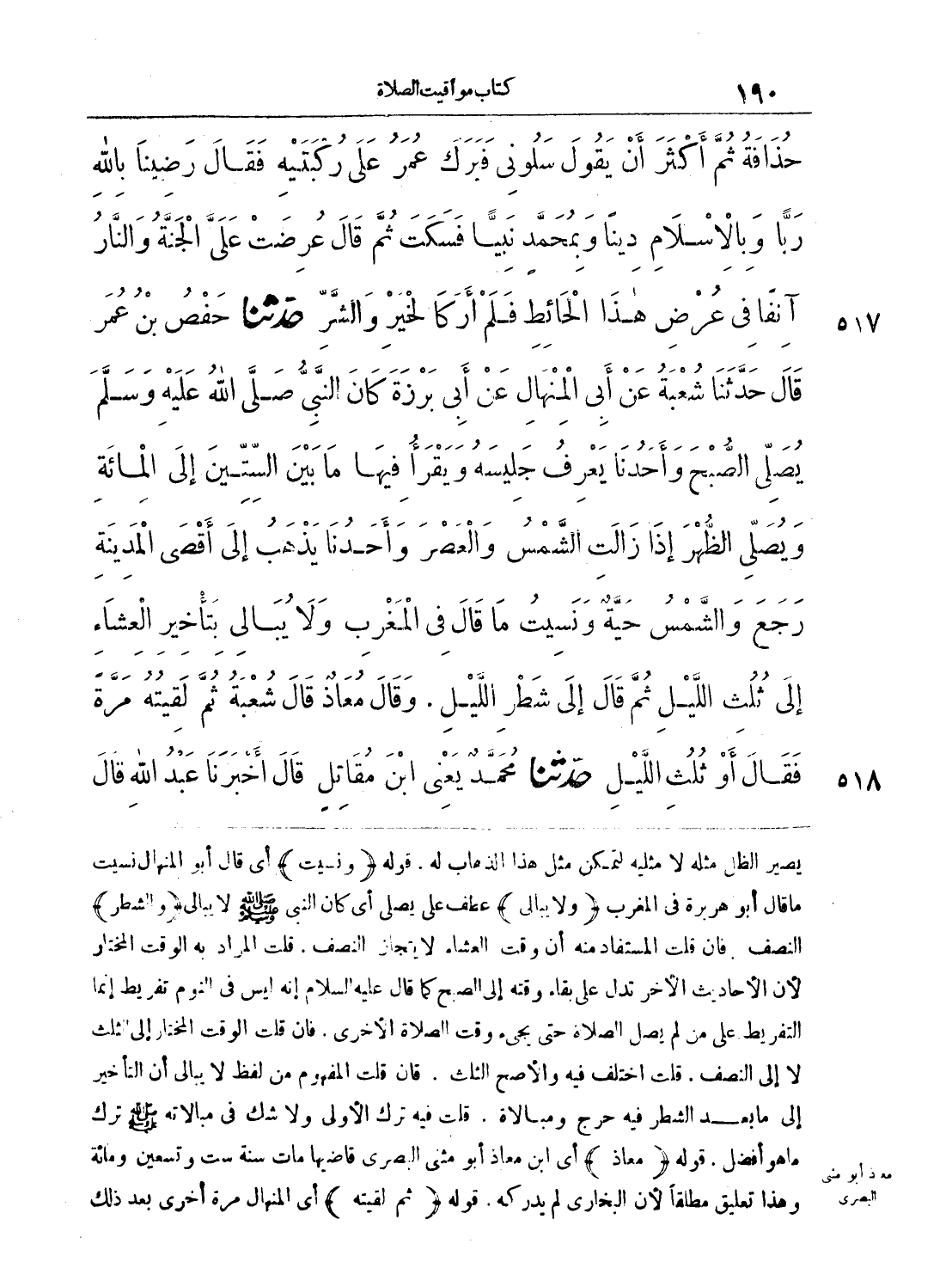 517 - حَدَّثَنَا حَفْصُ بْنُ عُمَرَ قَالَ حَدَّثَنَا شُعْبَةُ عَنْ أَبِى الْمِنْهَالِ عَنْ أَبِى بَرْزَةَ كَانَ النَّبِىُّ - صلى الله عليه وسلم - يُصَلِّى الصُّبْحَ وَأَحَدُنَا يَعْرِفُ جَلِيسَهُ، وَيَقْرَأُ فِيهَا مَا بَيْنَ السِّتِّينَ إِلَى الْمِائَةِ، وَيُصَلِّى الظُّهْرَ إِذَا زَالَتِ الشَّمْسُ، وَالْعَصْرَ وَأَحَدُنَا يَذْهَبُ إِلَى أَقْصَى الْمَدِينَةِ ثُمَّ يَرْجِعُ وَالشَّمْسُ حَيَّةٌ، وَنَسِيتُ مَا قَالَ فِى الْمَغْرِبِ، وَلاَ يُبَالِى بِتَاخِيرِ الْعِشَاءِ إِلَى ثُلُثِ اللَّيْلِ. ثُمَّ قَالَ إِلَى شَطْرِ اللَّيْلِ. وَقَالَ مُعَاذٌ قَالَ شُعْبَةُ ثُمَّ لَقِيتُهُ مَرَّةً فَقَالَ أَوْ ثُلُثِ اللَّيْلِ.