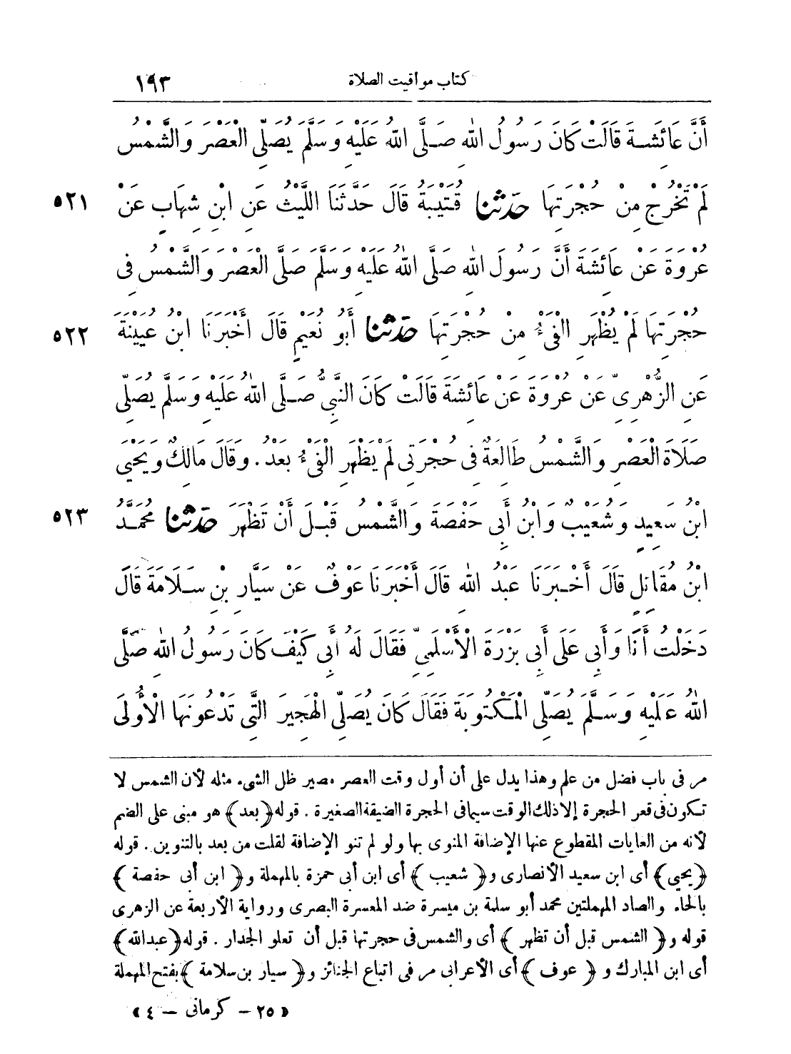 521 - حَدَّثَنَا قُتَيْبَةُ قَالَ حَدَّثَنَا اللَّيْثُ عَنِ ابْنِ شِهَابٍ عَنْ عُرْوَةَ عَنْ عَائِشَةَ أَنَّ رَسُولَ اللَّهِ - صلى الله عليه وسلم - صَلَّى الْعَصْرَ وَالشَّمْسُ فِى حُجْرَتِهَا، لَمْ يَظْهَرِ الْفَىْءُ مِنْ حُجْرَتِهَا