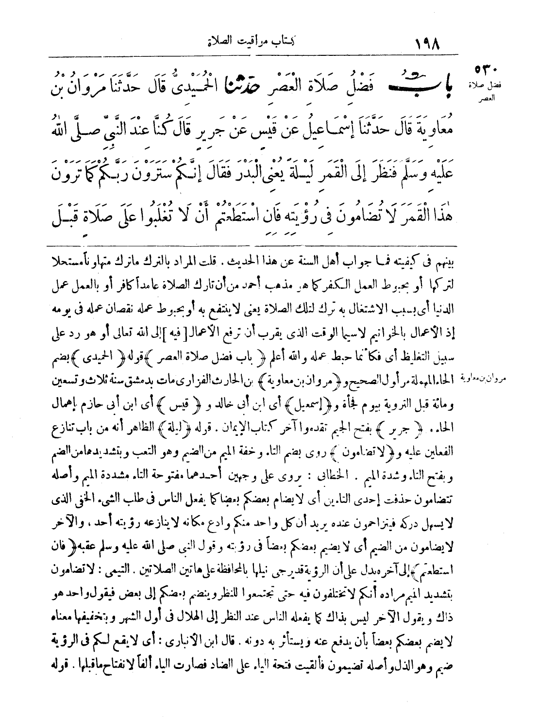 بينهم فى كيفيته فما جواب أهل السنة عن هذا الحديث. قلت المراد بالتركمن ترك متهاونا مستحلا لتركها أو بحبوط العمل الكفر كما هو مذهب أحمد من أن تارك الصلاة عامدا كافر أو بالعمل عمل النيا أى بسبب الاشتغال به ترك لتلك الصلاة يعنى لا ينتفع به أو بحبوط عمله نقصان عمله فى يومه إذ الأعمال بالخواتيم لا سيما الوقت الذى يقرب أن ترفع الأعمال فيه إلى الله تعالى أو هو رد على سبيل التغليظ أى كأنما حبط عمله والله اعلم (باب فضل صلاة العصر) قوله (الحميدى) بضم الحاء المهملة ضم أول الصحيح و (مروان بن معاوية) بن الحارث الفزارى مات بدمشق سنة ثلاث وتسعين ومائة قبل التروية بيوم فجأة و (إسمعيل) أى ابن أبى خالد و (قيس) أى ابن أبى حازم بإهمال الحاء و (جرير) بفتح الجيم تقدموا آخر كتاب الإيمان. قوله (ليلة) الظاهر أنه من باب تنازع الفعلين عليه و (لا تضامون) روى بضم التاء وخفة الميم من الضيم وهو التعب وبتشديدها من الضم وبفتح التاء وشدة الميم. الخطابى: يروى على وجهين أحدهما مفتوحة التاء مشددة الميم وأصله تتضامون حذفت إحدى التاءين أى لا يضام بعضكم بعضا كما يفعل الناس فى طلب الشىء الخفى الذى لا يسهل دركه فيتزاحمون عنده يريد أن كل واحد منكم وادع مكانه لا ينازعه رؤيته أحد , والآخر لا يضامون من الضيم أى لا يضيم بعضكم بعضا فىى رؤيته وقول النبى صلى الله عليه وسلم عقبه (فإن استطعتم) إلى آخره يدل على أن الرؤية قد يرجى نيلها بالمحافظة على هاتين الصلاتين. التيمى: لا تضامون بتشديد الميم مراده أنكم لا تختلفون فيه حتى تجتمعوا للنظر وينضم بعضكم إلى بعض فيقول واحد هو ذاك ويقول الآخر ليس ذاك كما يفعله الناس عند النظر إلى الهلال فى أول الشهر وبتخفيفها معناه لا يضم بعضكم بعضا بأن يدفع عنه ويستأثر به دونه. قال ابن الأنبارى: أى لا يقع لكم فى الرؤية ضيم وهو الذل وأصله تضيمون فألقيت فتحة الياء على الضاد فصارت الياء ألفا لإنفتاح ما قبلها. قوله