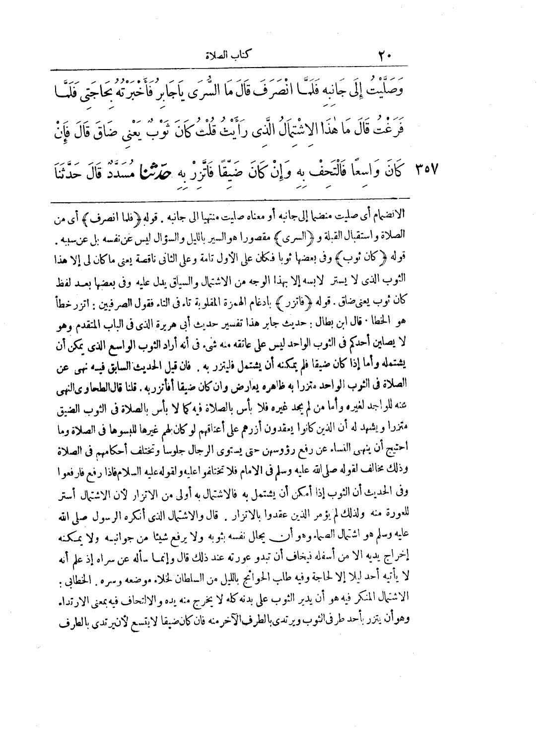 الانضمام أي صليت منضماً إلى جانبه أو معناه صليت منتهياً إلى جانبه. قوله (فلما انصرف) أي من الصلاة واستقبال القبلة و (السرى) مقصوراً هو السير بالليل والسؤال ليس عن نفسه بل عن سببه. قوله (كان ثوب) وفي بعضها ثوباً فكان على الأول تامة وعلى الثاني ناقصة يعني ما كان لي إلا هذا الثوب الذي لا يستر لابسه إلا بهذا الوجه من الاشتمال والسياق يدل عليه وفي بعضها بعد لفظ كان ثوب يعني ضاق. قوله (فاتزر) بإدغام الهمزة المقلوبة تاء في التاء فقول الصرفيين: اتزر خطأ هو الخطأ. قال ابن بطال: حديث جابر هذا تفسير حديث أبي هريرة الذي في الباب المتقدم وهو لا يصلين أحدكم في الثوب الواحد ليس على عاتقه منه شئ في أنه أراد الثوب الواسع الذي يمكن أن يشتمله وأما إذا كان ضيقاً فلم يمكنه أن يشتمل فليتزر به. فإن قيل الحديث السابق فيه نهي عن الصلاة في الثوب الواحد مُتزراً به ظاهره يعارض وإن كان ضيقاً أفأتزر به. قلنا قال الطحاوي النهي عنه للواجد لغيره وأما من لم يجد غيره فلا بأس بالصلاة فيه كما لا بأس بالصلاة في الثوب الضيق متزراً ويشهد له أن الذين كانوا يعقدون أزرهم على أعناقهم لو كان لهم غيرها للبسوها في الصلاة وما أحتيج أن ينهى النساء عن رفع رؤوسهن حتى يستوي الرجال جلوساً وتختلف أحكامهم في الصلاة وذلك مخالف لقوله - صلى الله عليه وسلم - في الإمام فلا تختلفوا عليه ولقوله عليه السلام فإذا رفع فارفعوا وفي الحديث أن الثوب إذا أمكن أن يشتمل به فالاشتمال به أولى من الاتزار لأن الاشتمال أستر للعورة منه ولذلك لم يؤمر الذين عقدوا بالاتزار. قال والاشتمال الذي أنكره الرسول - صلى الله عليه وسلم - هو اشتمال الصماء وهو أن يجلل نفسه بثوبه ولا يرفع شيئاً من جوانبه ولا يمكنه إخراج يديه إلا من أسفله فيخاف أن تبدو عورته عند ذلك قال وإنما سأله عن سراه إذ علم أنه لا يأتيه أحد ليلاً إلا لحاجة وفيه طلب الحوائج بالليل من السلطان لخلاء موضعه وسره. الخطابي: الاشتمال المنكر فيه هو أن يدير الثوب على بدنه كله لا يخرج منه يده والالتحاف فيه بمعنى الارتداء وهو أن يتزر بأحد طرفي الثوب ويرتدي بالطرف الآخر منه فإن كان ضيقاً لا يتسع لأن يرتدي بالطرف