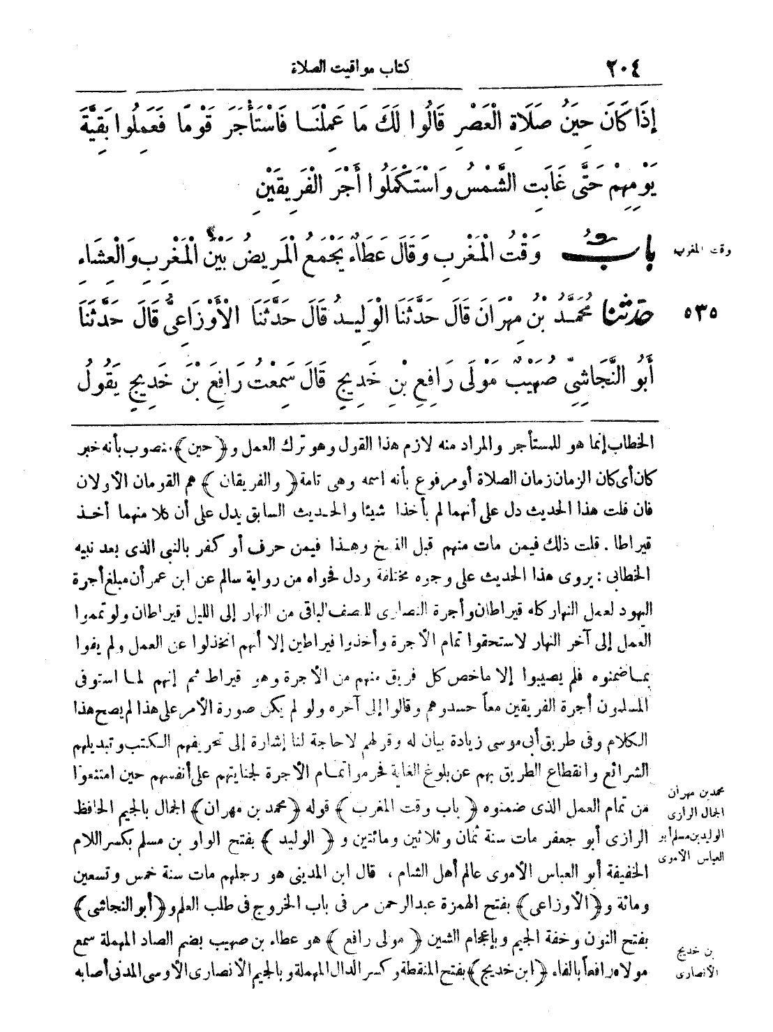 الخطاب إنما هو للمستأجر والمراد منه لازم هذا القول وهو ترك العمل و (حين) منصوب بأنه خبر كان أى كان الزمان زمان الصلاة أو مرفوع بأنه اسمه وهى تامة (والفريقان) هم القومان الأولان فإن قلت هذا الحديث دل على أنهما لم يأخذا شيئا والحديث السابق يدل على أن كلا منهما أخذ قيراطا. قلت ذلك فيمن مات منهم قبل النسخ وهذا فيمن حرف أو كفر بالنبى الذى بعد نبيه. الخطابى: يروى هذا الحديث على وجوه مختلفة ودل فحواه من رواية سالم عن ابن عمر أن مبلغ أجرة اليهود لعمل النهار كله قيراطان وأجرة النصارى للصف الباقى من النهار إلى الليل قيراطان ولا تمموا العمل إلى آخر النهار لأستحقوا تمام الأاجرة وأخذوا قيراطين إلا أنهم انخذلوا عن العمل ولم يفوا بما ضمنوه فلم يصيبوا إلا ما خص كل فريق منهم من الأجرة وهو قيراط ثم إنهم لما استوفى المسلمون أجرة الفريقين معا حسدوهم وقالوا إلى آخره ولو لم يكن صورة الأمر على هذا لم يصح هذا الكلام وفى طريق أبى موسى زيادة بيان له وقر لهم لا حاجة لنا إشارة إلى تحريفهم الكتب وتبديلهم الشرائع وانقطاع الطريق بهم عن بلوغ الغاية فحرموا إتمام الأجرة لجنايتهم على أنفسهم حين امتنعوا من تمام العمل الذى ضمنوه (باب وقت المغرب) قوله (محمد مهران) الجمال بالجيم الحافظ الرازى أبو جعفر مات سنة ثمان وثلاثين ومائتين و (الوليد) بفتح الواو بن مسلم بكسر اللام الخفيفة أبو العباس الأموى عالم أهل الشام , قال ابن المدينى هو رجلهم مات سنة خمس وتسعين ومائة و (الأوزاعى) بفتح الهمزة عب الرحمن مر فى باب الخروج فى طلب العلم و (أبو النجاشى) بفتح النون وخفة الجيم وبإعجام الشين (مولى رافع) هو عطاء بن صهيب بضم الصاد المهملة سمع مولاه رافعا بالفاء (ابن خديج) بفتح المنقطة وكسر الدال المهملة وبالجيم الأنصارى الأوسى المدنى أصابه