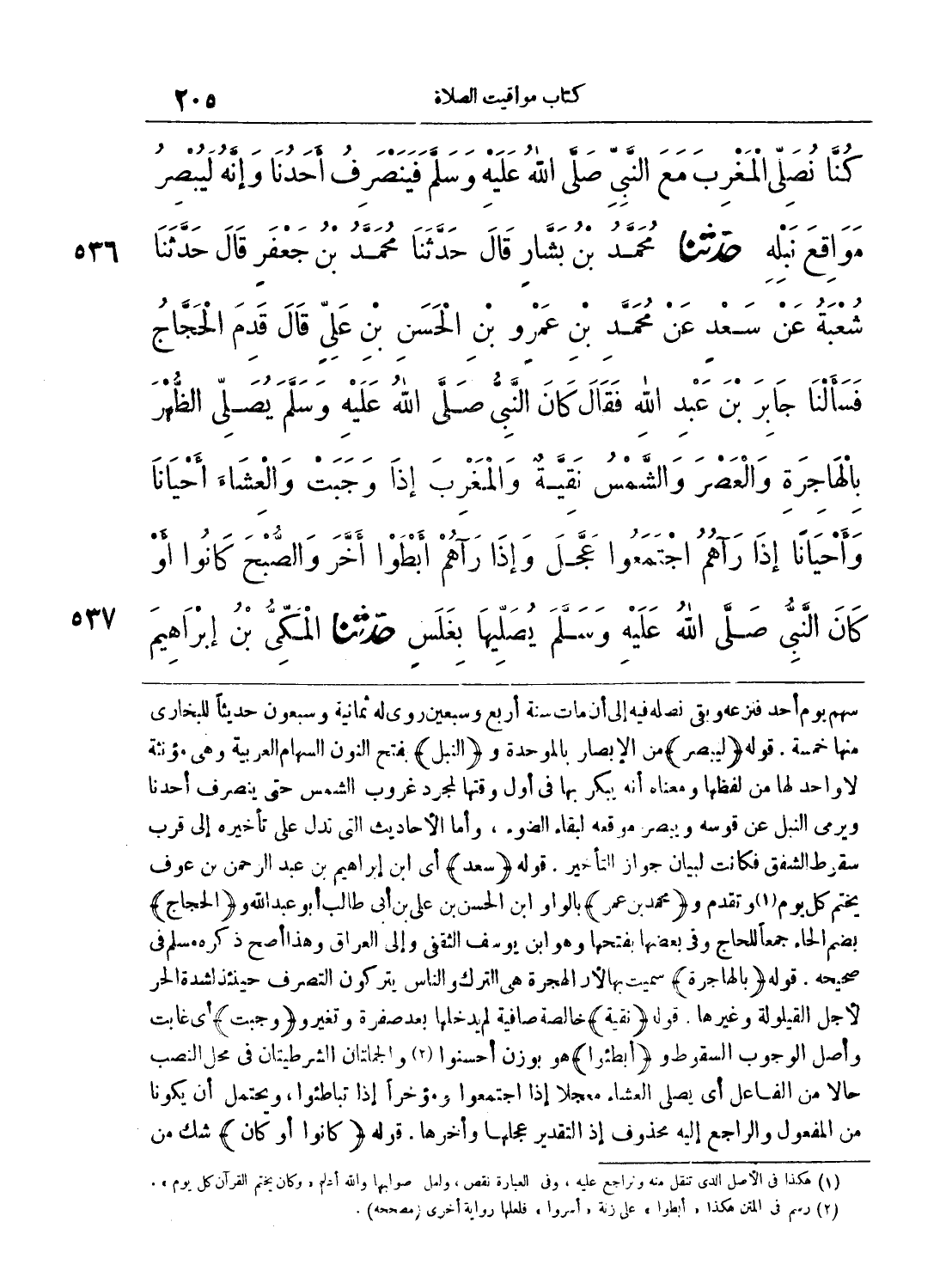 536 - حَدَّثَنَا مُحَمَّدُ بْنُ بَشَّارٍ قَالَ حَدَّثَنَا مُحَمَّدُ بْنُ جَعْفَرٍ قَالَ حَدَّثَنَا شُعْبَةُ عَنْ سَعْدٍ عَنْ مُحَمَّدِ بْنِ عَمْرِو بْنِ الْحَسَنِ بْنِ عَلِىٍّ قَالَ قَدِمَ الْحَجَّاجُ فَسَأَلْنَا جَابِرَ بْنَ عَبْدِ اللَّهِ فَقَالَ كَانَ النَّبِىُّ - صلى الله عليه وسلم - يُصَلِّى الظُّهْرَ بِالْهَاجِرَةِ، وَالْعَصْرَ وَالشَّمْسُ نَقِيَّةٌ، وَالْمَغْرِبَ إِذَا وَجَبَتْ، وَالْعِشَاءَ أَحْيَاناً وَأَحْيَاناً، إِذَا رَآهُمُ اجْتَمَعُوا عَجَّلَ، وَإِذَا رَآهُمْ أَبْطَوْا أَخَّرَ، وَالصُّبْحَ كَانُوا - أَوْ كَانَ النَّبِىُّ - صلى الله عليه وسلم - يُصَلِّيهَا بِغَلَسٍ