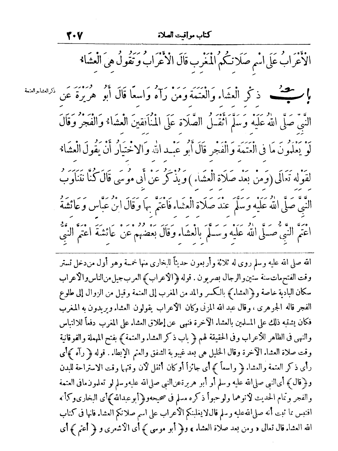 الله صلى الله عليه وسلم روى له ثلاثة وأربعون حديثا للبخارى منها خمسة وهو أول من دخل تستر وقت الفتح مات سنة ستين والرجال بصريون. قوله (الأعراب) العرب جيل من الناس والأعراب سكان البادية خاصة و (العشاء) بالكسر والمد من المغرب إلى المتعة وقيل من الزوال إلى طلوع الفجر قاله الجوهرى , وقال عبدالله المزنى وكان الأعراب يقولون العشاء ويريدون به المغرب فكان يتشبه ذلك على المسلمين بالعشاء الآخرة فنهى عن إطلاق العشاء على المغرب دفعا للالتباس والنهى فى الظاهر للأعراب وفى الحقيقة لهم (باب ذكر العشاء والعتمة) بفتح المهملة والفوقانية وقت صلاة العشاء الآخرة وقال الخليل هى بعد غيبوبة الشفق والعتم الإبطاء. قوله (رآه) أى رأى ذكر العتمة والعشاء (واسعا) أى جائزا أو كان أثقل لأن وقتهما وقت الاستراحة للبدن و (قال) أى النبى صلى الله عليه وسلم أو أبو هريرة عن النبى صلى الله عليه وسلم لو تعلمون ما فى العتمة والفجر وتمام الحديث لأتوهما ولو حبوا ذكره مسلم فى صحيحه و (أبو عبدالله) أى البخارى وكأنه اقتبس مما ثبت أنه صلى الله عليه وسلم قال لا يغلبنكم الأعراب على اسم صلاتكم العشاء فانها فى كتاب الله العشاء قال تعالى ((ومن بعد صلاة العشاء)) و (أبو موسى) أى الأشعرى و (أعتم) أي