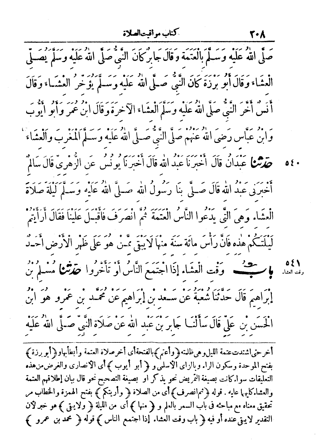- صلى الله عليه وسلم - بِالْعَتَمَةِ. وَقَالَ جَابِرٌ كَانَ النَّبِىُّ - صلى الله عليه وسلم - يُصَلِّى الْعِشَاءَ. وَقَالَ أَبُو بَرْزَةَ كَانَ النَّبِىُّ - صلى الله عليه وسلم - يُؤَخِّرُ الْعِشَاءَ. وَقَالَ أَنَسٌ أَخَّرَ النَّبِىُّ - صلى الله عليه وسلم - الْعِشَاءَ الآخِرَةَ. وَقَالَ ابْنُ عُمَرَ وَأَبُو أَيُّوبَ وَابْنُ عَبَّاسٍ - رضى الله عنهم - صَلَّى النَّبِىُّ - صلى الله عليه وسلم - الْمَغْرِبَ وَالْعِشَاءَ.