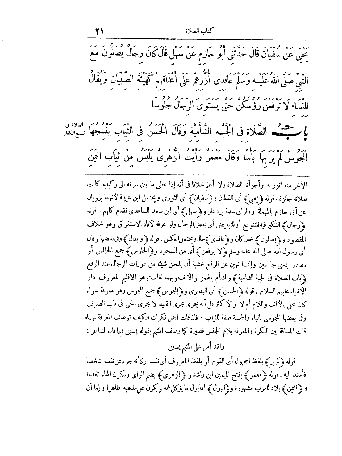 الآخر منه اتزر به وأجزأته الصلاة ولا أعلم خلافاً في أنه إذا غطى ما بين سرته إلى ركبتيه كانت صلاته جائزة. قوله (يحيى) أي القطان و (سفيان) أي الثوري ويحتمل ابن عيينة لأنهما يرويان عن أبي حازم بالمهملة وبالزاي سلمة بن دينار و (سهل) أي ابن سعد الساعدي تقدم كلهم. قوله (رجال) التنكير فيه للتنويع أو للتبعيض أي بعض الرجال ولو عرفه لأفاد الاستغراق وهو خلاف المقصود و (يصلون) خبر كان و (عاقدي) حال ويحتمل العكس. قوله (ويقال) وفي بعضها وقال أي رسول الله - صلى الله عليه وسلم - (لا يرفعن) أي من السجود و (الجلوس) جمع الجالس أو مصدر بمعنى جالسين وإنما نهين عن الرفع خشية أن يلمحن شيئاً من عورات الرجال عند الرفع (باب الصلاة في الجبة الشامية) والشأم بالهمز والألف وبهما لغات. وهو الإقليم المعروف دار الأنبياء عليهم السلام. قوله (الحسن) أي البصري و (المجوس) جمع المجوس وهو معرفة سواء كان محلى بالألف واللام أم لا والأكثر على أنه يجري مجرى القبيلة لا يجري الحي في باب الصرف وفي بعضها المجوسي بالياء والجملة صفة للثياب. فإن فلت الجمل نكرات فكيف توصف المعرفة بها. قلت المسافة بين النكرة والمعرفة بلام الجنس قصيرة كما وصف اللئيم بقوله يسبني فيما قال الشاعر: