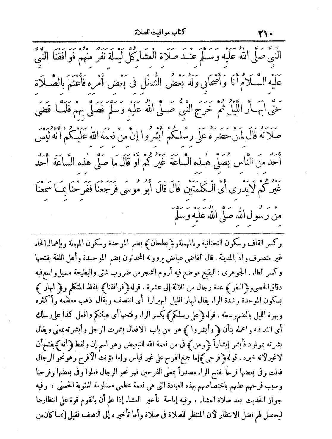 النَّبِىَّ - صلى الله عليه وسلم - عِنْدَ صَلاَةِ الْعِشَاءِ كُلَّ لَيْلَةٍ نَفَرٌ مِنْهُمْ، فَوَافَقْنَا النَّبِىَّ - عليه السلام - أَنَا وَأَصْحَابِى وَلَهُ بَعْضُ الشُّغْلِ فِى بَعْضِ أَمْرِهِ فَأَعْتَمَ بِالصَّلاَةِ حَتَّى ابْهَارَّ اللَّيْلُ، ثُمَّ خَرَجَ النَّبِىُّ - صلى الله عليه وسلم - فَصَلَّى بِهِمْ، فَلَمَّا قَضَى صَلاَتَهُ قَالَ لِمَنْ حَضَرَهُ «عَلَى رِسْلِكُمْ، أَبْشِرُوا إِنَّ مِنْ نِعْمَةِ اللَّهِ عَلَيْكُمْ أَنَّهُ لَيْسَ أَحَدٌ مِنَ النَّاسِ يُصَلِّى هَذِهِ السَّاعَةَ غَيْرُكُمْ». أَوْ قَالَ «مَا صَلَّى هَذِهِ السَّاعَةَ أَحَدٌ غَيْرُكُمْ». لاَ يَدْرِى أَىَّ الْكَلِمَتَيْنِ قَالَ. قَالَ أَبُو مُوسَى فَرَجَعْنَا فَفَرِحْنَا بِمَا سَمِعْنَا مِنْ رَسُولِ اللَّهِ - صلى الله عليه وسلم -.