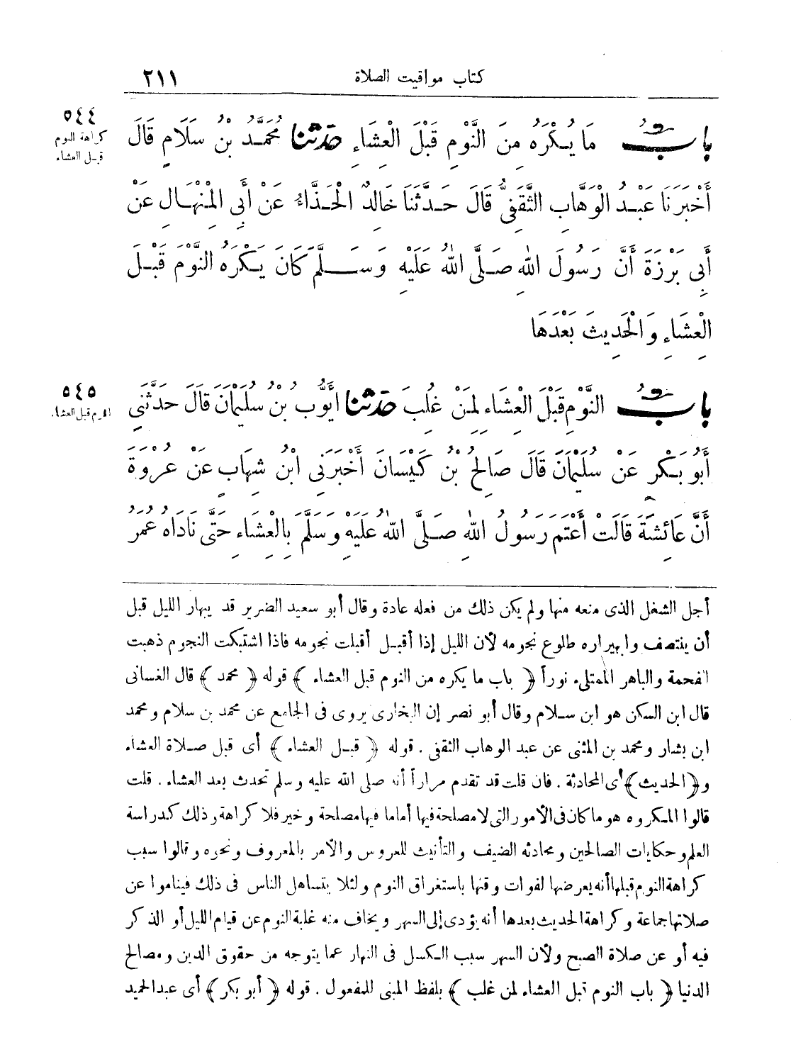 544 - حَدَّثَنَا مُحَمَّدُ بْنُ سَلاَمٍ قَالَ أَخْبَرَنَا عَبْدُ الْوَهَّابِ الثَّقَفِىُّ قَالَ حَدَّثَنَا خَالِدٌ الْحَذَّاءُ عَنْ أَبِى الْمِنْهَالِ عَنْ أَبِى بَرْزَةَ أَنَّ رَسُولَ اللَّهِ - صلى الله عليه وسلم - كَانَ يَكْرَهُ النَّوْمَ قَبْلَ الْعِشَاءِ وَالْحَدِيثَ بَعْدَهَا.