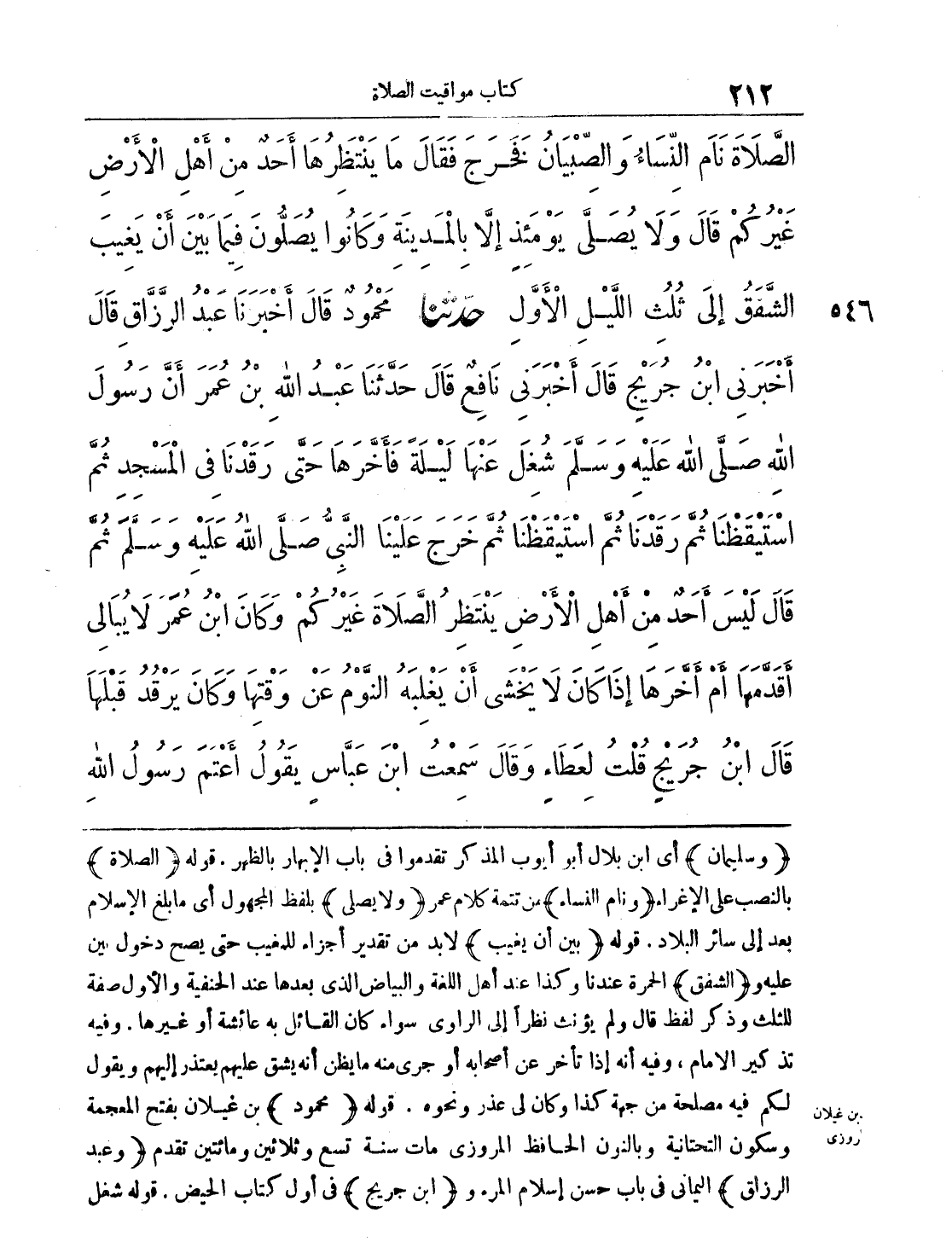 546 - حَدَّثَنَا مَحْمُودٌ قَالَ أَخْبَرَنَا عَبْدُ الرَّزَّاقِ قَالَ أَخْبَرَنِى ابْنُ جُرَيْجٍ قَالَ أَخْبَرَنِى نَافِعٌ قَالَ حَدَّثَنَا عَبْدُ اللَّهِ بْنُ عُمَرَ أَنَّ رَسُولَ اللَّهِ - صلى الله عليه وسلم - شُغِلَ عَنْهَا لَيْلَةً، فَأَخَّرَهَا حَتَّى رَقَدْنَا فِى الْمَسْجِدِ، ثُمَّ اسْتَيْقَظْنَا ثُمَّ رَقَدْنَا ثُمَّ اسْتَيْقَظْنَا، ثُمَّ خَرَجَ عَلَيْنَا النَّبِىُّ - صلى الله عليه وسلم - ثُمَّ قَالَ «لَيْسَ أَحَدٌ مِنْ أَهْلِ الأَرْضِ يَنْتَظِرُ الصَّلاَةَ غَيْرُكُمْ». وَكَانَ ابْنُ عُمَرَ لاَ يُبَالِى أَقَدَّمَهَا أَمْ أَخَّرَهَا إِذَا كَانَ لاَ يَخْشَى أَنْ يَغْلِبَهُ النَّوْمُ عَنْ وَقْتِهَا، وَكَانَ يَرْقُدُ قَبْلَهَا. قَالَ ابْنُ جُرَيْجٍ قُلْتُ لِعَطَاءٍ وَقَالَ سَمِعْتُ ابْنَ عَبَّاسٍ يَقُولُ أَعْتَمَ رَسُولُ اللَّهِ