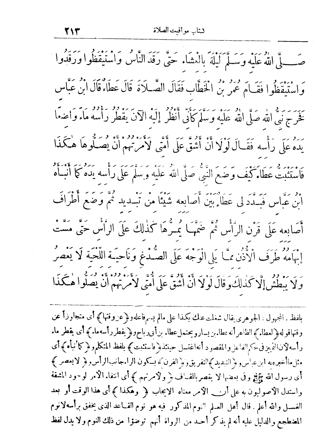 - صلى الله عليه وسلم - لَيْلَةً بِالْعِشَاءِ حَتَّى رَقَدَ النَّاسُ وَاسْتَيْقَظُوا، وَرَقَدُوا وَاسْتَيْقَظُوا، فَقَامَ عُمَرُ بْنُ الْخَطَّابِ فَقَالَ الصَّلاَةَ. قَالَ عَطَاءٌ قَالَ ابْنُ عَبَّاسٍ فَخَرَجَ نَبِىُّ اللَّهِ صلى الله عليه وسلم كَأَنِّى أَنْظُرُ إِلَيْهِ الآنَ، يَقْطُرُ رَاسُهُ مَاءً، وَاضِعاً يَدَهُ عَلَى رَاسِهِ فَقَالَ «لَوْلاَ أَنْ أَشُقَّ عَلَى أُمَّتِى لأَمَرْتُهُمْ أَنْ يُصَلُّوهَا هَكَذَا». فَاسْتَثْبَتُّ عَطَاءً كَيْفَ وَضَعَ النَّبِىُّ - صلى الله عليه وسلم - عَلَى رَاسِهِ يَدَهُ كَمَا أَنْبَأَهُ ابْنُ عَبَّاسٍ، فَبَدَّدَ لِى عَطَاءٌ بَيْنَ أَصَابِعِهِ شَيْئاً مِنْ تَبْدِيدٍ، ثُمَّ وَضَعَ أَطْرَافَ أَصَابِعِهِ عَلَى قَرْنِ الرَّاسِ ثُمَّ ضَمَّهَا، يُمِرُّهَا كَذَلِكَ عَلَى الرَّاسِ حَتَّى مَسَّتْ إِبْهَامُهُ طَرَفَ الأُذُنِ مِمَّا يَلِى الْوَجْهَ عَلَى الصُّدْغِ، وَنَاحِيَةِ اللِّحْيَةِ، لاَ يُقَصِّرُ وَلاَ يَبْطُشُ إِلاَّ كَذَلِكَ وَقَالَ «لَوْلاَ أَنْ أَشُقَّ عَلَى أُمَّتِى لأَمَرْتُهُمْ أَنْ يُصَلُّوا هَكَذَا»