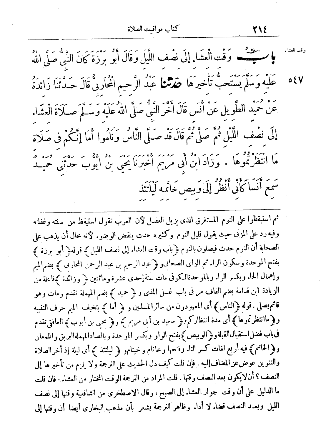 547 - حَدَّثَنَا عَبْدُ الرَّحِيمِ الْمُحَارِبِىُّ قَالَ حَدَّثَنَا زَائِدَةُ عَنْ حُمَيْدٍ الطَّوِيلِ عَنْ أَنَسٍ قَالَ أَخَّرَ النَّبِىُّ - صلى الله عليه وسلم - صَلاَةَ الْعِشَاءِ إِلَى نِصْفِ اللَّيْلِ، ثُمَّ صَلَّى ثُمَّ قَالَ «قَدْ صَلَّى النَّاسُ وَنَامُوا، أَمَا إِنَّكُمْ فِى صَلاَةٍ مَا انْتَظَرْتُمُوهَا». وَزَادَ ابْنُ أَبِى مَرْيَمَ أَخْبَرَنَا يَحْيَى بْنُ أَيُّوبَ حَدَّثَنِى حُمَيْدٌ سَمِعَ أَنَساً كَأَنِّى أَنْظُرُ إِلَى وَبِيصِ خَاتَمِهِ لَيْلَتَئِذٍ.