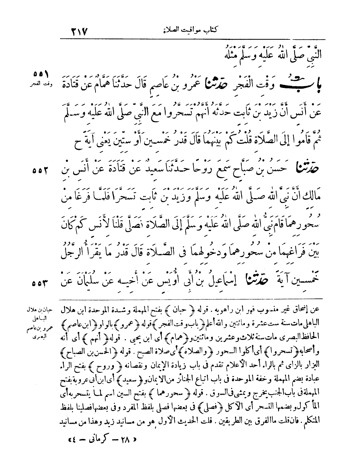 551 - حَدَّثَنَا عَمْرُو بْنُ عَاصِمٍ قَالَ حَدَّثَنَا هَمَّامٌ عَنْ قَتَادَةَ عَنْ أَنَسٍ أَنَّ زَيْدَ بْنَ ثَابِتٍ حَدَّثَهُ أَنَّهُمْ تَسَحَّرُوا مَعَ النَّبِىِّ - صلى الله عليه وسلم - ثُمَّ قَامُوا إِلَى الصَّلاَةِ. قُلْتُ كَمْ بَيْنَهُمَا قَالَ قَدْرُ خَمْسِينَ أَوْ سِتِّينَ - يَعْنِى آيَةً - ح