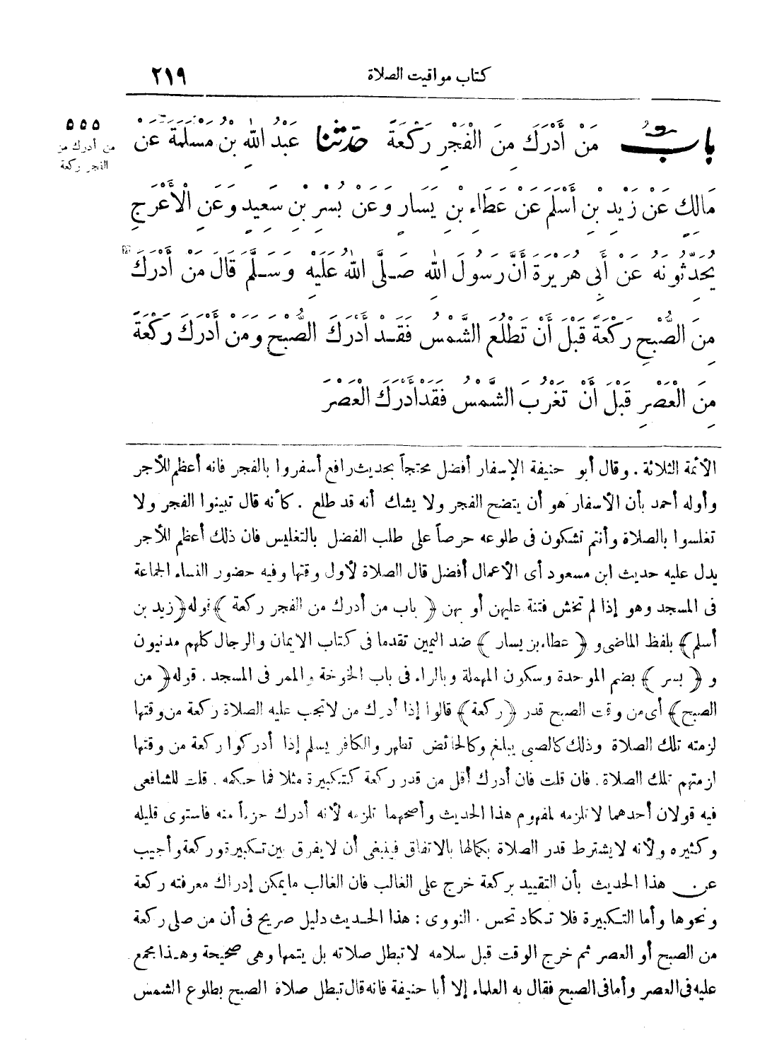555 - حَدَّثَنَا عَبْدُ اللَّهِ بْنُ مَسْلَمَةَ عَنْ مَالِكٍ عَنْ زَيْدِ بْنِ أَسْلَمَ عَنْ عَطَاءِ بْنِ يَسَارٍ وَعَنْ بُسْرِ بْنِ سَعِيدٍ وَعَنِ الأَعْرَجِ يُحَدِّثُونَهُ عَنْ أَبِى هُرَيْرَةَ أَنَّ رَسُولَ اللَّهِ - صلى الله عليه وسلم - قَالَ «مَنْ أَدْرَكَ مِنَ الصُّبْحِ رَكْعَةً قَبْلَ أَنْ تَطْلُعَ الشَّمْسُ فَقَدْ أَدْرَكَ الصُّبْحَ، وَمَنْ أَدْرَكَ رَكْعَةً مِنَ الْعَصْرِ قَبْلَ أَنْ تَغْرُبَ الشَّمْسُ فَقَدْ أَدْرَكَ الْعَصْرَ».