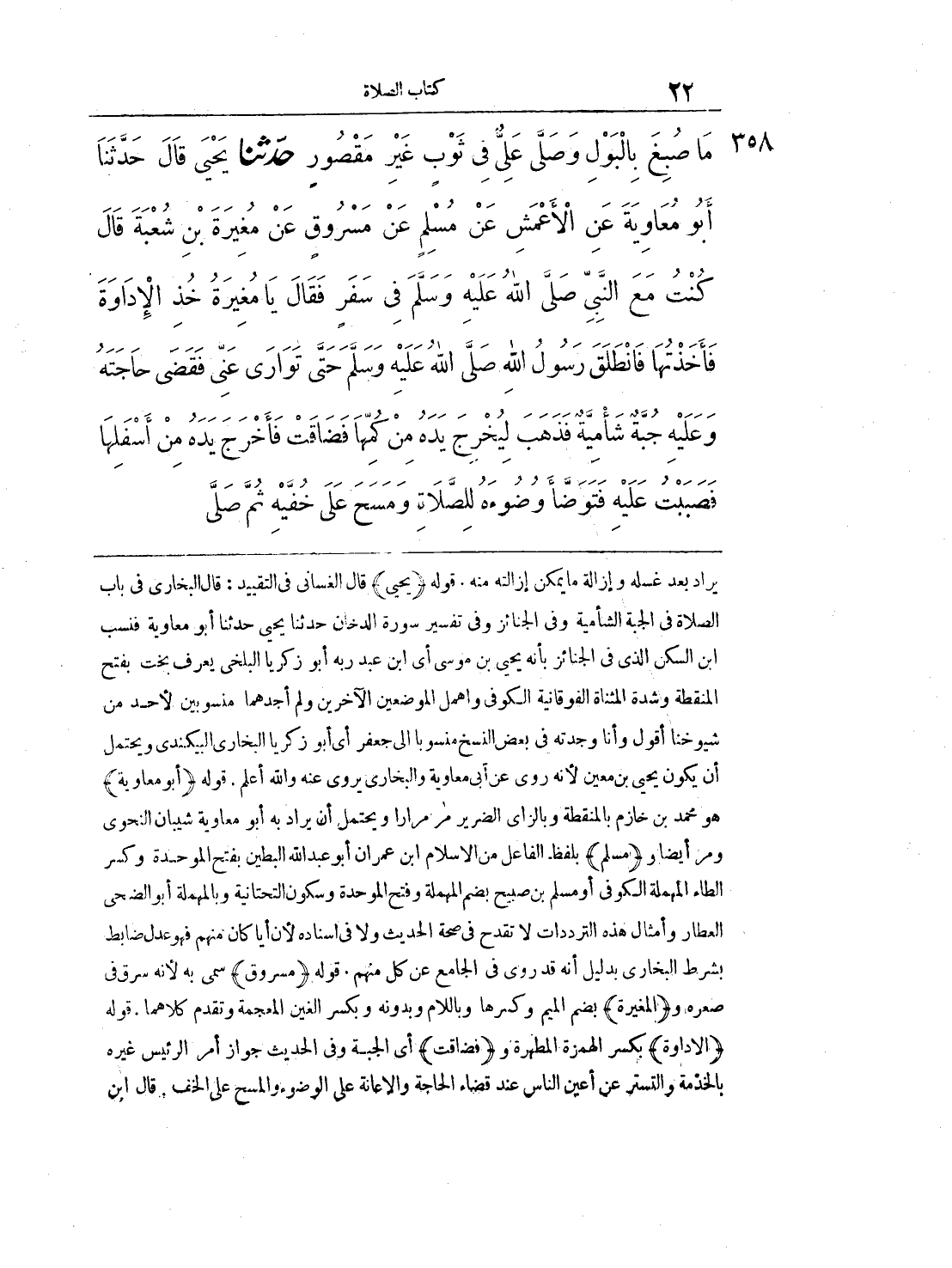 358 - حَدَّثَنَا يَحْيَى قَالَ حَدَّثَنَا أَبُو مُعَاوِيَةَ عَنِ الأَعْمَشِ عَنْ مُسْلِمٍ عَنْ مَسْرُوقٍ عَنْ مُغِيرَةَ بْنِ شُعْبَةَ قَالَ كُنْتُ مَعَ النَّبِىِّ - صلى الله عليه وسلم - فِى سَفَرٍ فَقَالَ «يَا مُغِيرَةُ، خُذِ الإِدَاوَةَ». فَأَخَذْتُهَا فَانْطَلَقَ رَسُولُ اللَّهِ - صلى الله عليه وسلم - حَتَّى تَوَارَى عَنِّى فَقَضَى حَاجَتَهُ، وَعَلَيْهِ جُبَّةٌ شَامِيَّةٌ، فَذَهَبَ لِيُخْرِجَ يَدَهُ مِنْ كُمِّهَا فَضَاقَتْ، فَأَخْرَجَ يَدَهُ مِنْ أَسْفَلِهَا، فَصَبَبْتُ عَلَيْهِ فَتَوَضَّأَ وُضُوءَهُ لِلصَّلاَةِ، وَمَسَحَ عَلَى خُفَّيْهِ، ثُمَّ صَلَّى