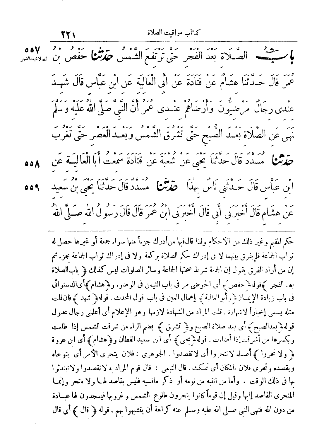 557 - حَدَّثَنَا حَفْصُ بْنُ عُمَرَ قَالَ حَدَّثَنَا هِشَامٌ عَنْ قَتَادَةَ عَنْ أَبِى الْعَالِيَةِ عَنِ ابْنِ عَبَّاسٍ قَالَ شَهِدَ عِنْدِى رِجَالٌ مَرْضِيُّونَ وَأَرْضَاهُمْ عِنْدِى عُمَرُ أَنَّ النَّبِىَّ - صلى الله عليه وسلم - نَهَى عَنِ الصَّلاَةِ بَعْدَ الصُّبْحِ حَتَّى تَشْرُقَ الشَّمْسُ، وَبَعْدَ الْعَصْرِ حَتَّى تَغْرُبَ.