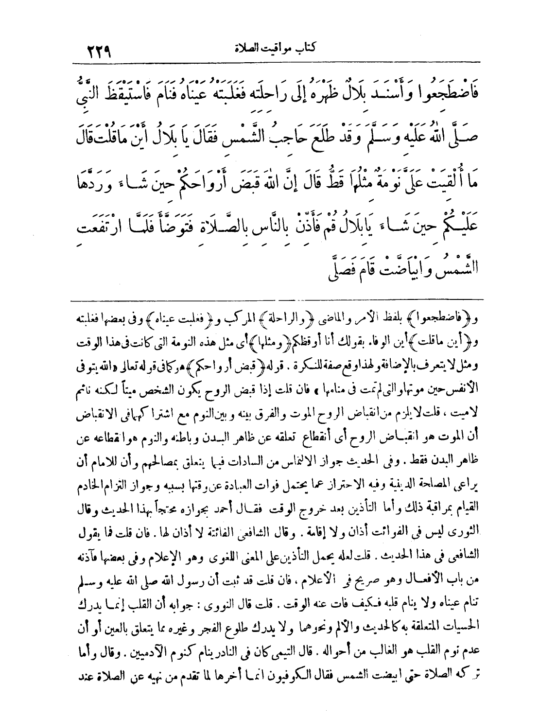 فَاضْطَجَعُوا وَأَسْنَدَ بِلاَلٌ ظَهْرَهُ إِلَى رَاحِلَتِهِ، فَغَلَبَتْهُ عَيْنَاهُ فَنَامَ، فَاسْتَيْقَظَ النَّبِىُّ يَا بِلاَلُ أَيْنَ مَا قُلْتَ». قَالَ مَا أُلْقِيَتْ عَلَىَّ نَوْمَةٌ مِثْلُهَا قَطُّ. قَالَ «إِنَّ اللَّهَ قَبَضَ أَرْوَاحَكُمْ حِينَ شَاءَ، وَرَدَّهَا عَلَيْكُمْ حِينَ شَاءَ، يَا بِلاَلُ قُمْ فَأَذِّنْ بِالنَّاسِ بِالصَّلاَةِ». فَتَوَضَّأَ فَلَمَّا ارْتَفَعَتِ الشَّمْسُ وَابْيَاضَّتْ قَامَ فَصَلَّى