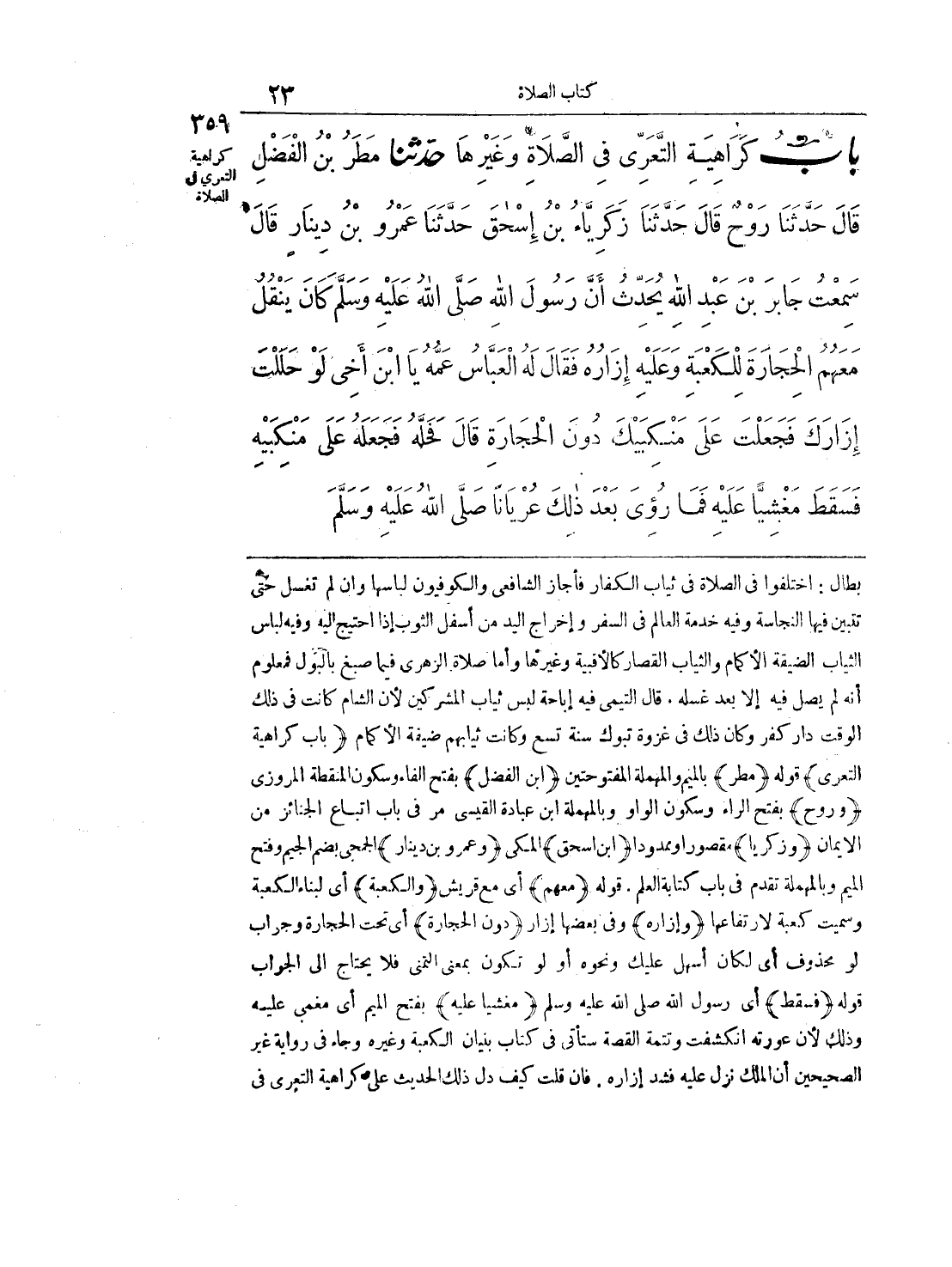 359 - حَدَّثَنَا مَطَرُ بْنُ الْفَضْلِ قَالَ حَدَّثَنَا رَوْحٌ قَالَ حَدَّثَنَا زَكَرِيَّاءُ بْنُ إِسْحَاقَ حَدَّثَنَا عَمْرُو بْنُ دِينَارٍ قَالَ سَمِعْتُ جَابِرَ بْنَ عَبْدِ اللَّهِ يُحَدِّثُ أَنَّ رَسُولَ اللَّهِ - صلى الله عليه وسلم - كَانَ يَنْقُلُ مَعَهُمُ الْحِجَارَةَ لِلْكَعْبَةِ وَعَلَيْهِ إِزَارُهُ. فَقَالَ لَهُ الْعَبَّاسُ عَمُّهُ يَا ابْنَ أَخِى، لَوْ حَلَلْتَ إِزَارَكَ فَجَعَلْتَ عَلَى مَنْكِبَيْكَ دُونَ الْحِجَارَةِ. قَالَ فَحَلَّهُ فَجَعَلَهُ عَلَى مَنْكِبَيْهِ، فَسَقَطَ مَغْشِيًّا عَلَيْهِ، فَمَا رُئِىَ بَعْدَ ذَلِكَ عُرْيَاناً - صلى الله عليه وسلم -