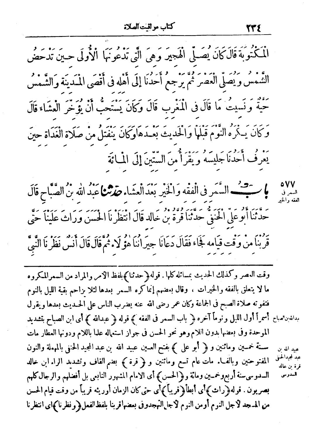 وقت العصر وكذلك الحديث بمسائله كلها. قوله (حدثنا) بلفظ الأمر والمراد من السمر المكروه ما لا يتعلق بالفقه والخيرات , وقال بعضهم إنما كره السمر بعدها لئلا يزاحم بقية الليل بالنوم فتفوته صلاة الصبح فى الجماعة وكان عمر رضى الله عنه يضرب الناس على الحديث بعدها ويقول أسمرا أول الليل ونوما آخره (باب السمر فى الفقه) قوله (عبدالله) أى ابن الصباح بتشديد الموحدة وفى بعضها بدون اللام وهو نحو الحسن فى جواز استعماله علما باللام ودونها العطار مات سنة خمسين ومائتين و (أبو على) بفتح العين عبيدالله بن عبدالمجيد الحنفى بالمهملة والنون المفتوحتين وبالفاء مات عام تسع ومائتين و (قرة) بضم القاف وتشديد الراء ابن خالد السدوسى سنة أربع وخمسين ومائة و (الحسن) أى الامام المشهور التابعى بل أفضلهم والرجال كلهم بصريون. قوله (راث) أى أبطأ (قريبا) أى حتى كان الزمان أوريثه قريبا من وقت قيام الحسن من المسجد لأجل النوم أو من النوم لأجل التهجد وفى بعضها قربنا بلفظ الفعل (ونظرنا) أي انتظرنا