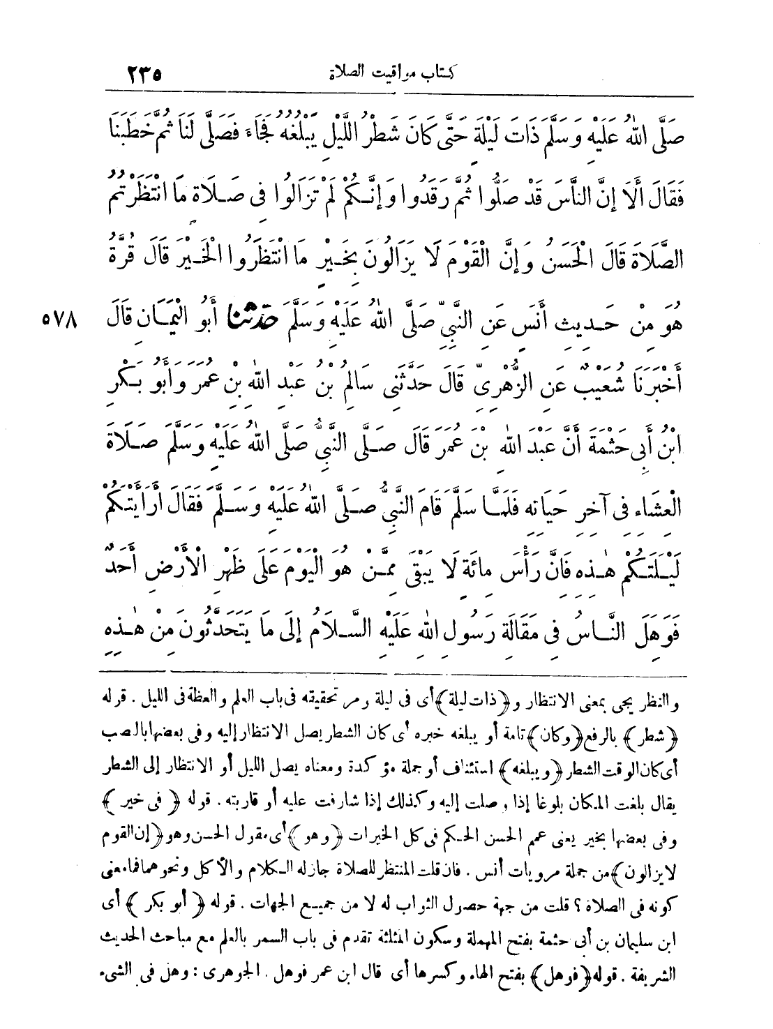 - صلى الله عليه وسلم - ذَاتَ لَيْلَةٍ حَتَّى كَانَ شَطْرُ اللَّيْلِ يَبْلُغُهُ، فَجَاءَ فَصَلَّى لَنَا، ثُمَّ خَطَبَنَا فَقَالَ «أَلاَ إِنَّ النَّاسَ قَدْ صَلَّوْا ثُمَّ رَقَدُوا، وَإِنَّكُمْ لَمْ تَزَالُوا فِى صَلاَةٍ مَا انْتَظَرْتُمُ الصَّلاَةَ». قَالَ الْحَسَنُ وَإِنَّ الْقَوْمَ لاَ يَزَالُونَ بِخَيْرٍ مَا انْتَظَرُوا الْخَيْرَ. قَالَ قُرَّةُ هُوَ مِنْ حَدِيثِ أَنَسٍ عَنِ النَّبِىِّ - صلى الله عليه وسلم -.