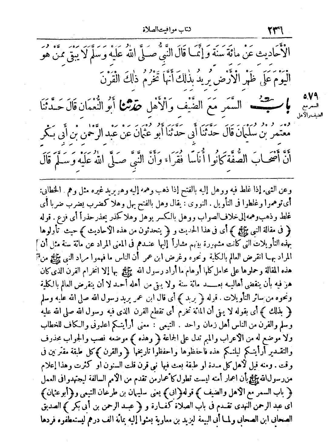الأَحَادِيثِ عَنْ مِائَةِ سَنَةٍ، وَإِنَّمَا قَالَ النَّبِىُّ - صلى الله عليه وسلم - «لاَ يَبْقَى مِمَّنْ هُوَ الْيَوْمَ عَلَى ظَهْرِ الأَرْضِ» يُرِيدُ بِذَلِكَ أَنَّهَا تَخْرِمُ ذَلِكَ الْقَرْنَ.