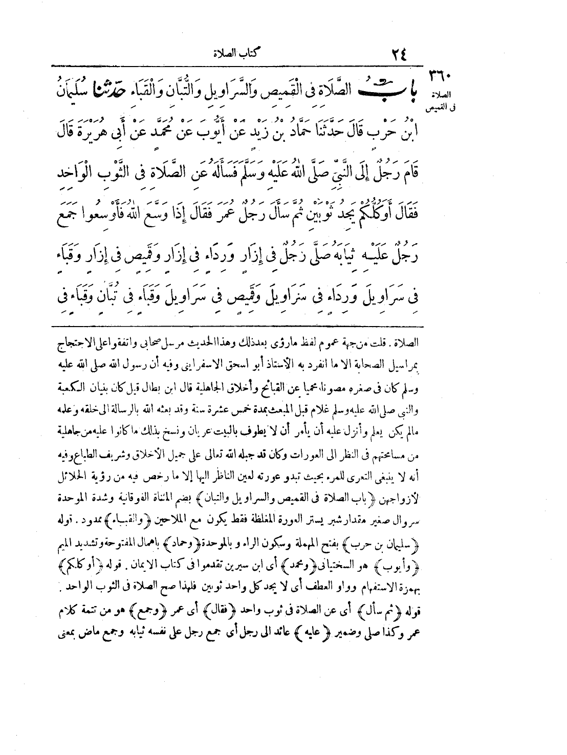 360 - حَدَّثَنَا سُلَيْمَانُ بْنُ حَرْبٍ قَالَ حَدَّثَنَا حَمَّادُ بْنُ زَيْدٍ عَنْ أَيُّوبَ عَنْ مُحَمَّدٍ عَنْ أَبِى هُرَيْرَةَ قَالَ قَامَ رَجُلٌ إِلَى النَّبِىِّ - صلى الله عليه وسلم - فَسَأَلَهُ عَنِ الصَّلاَةِ فِى الثَّوْبِ الْوَاحِدِ فَقَالَ «أَوَكُلُّكُمْ يَجِدُ ثَوْبَيْنِ». ثُمَّ سَأَلَ رَجُلٌ عُمَرَ فَقَالَ إِذَا وَسَّعَ اللَّهُ فَأَوْسِعُوا، جَمَعَ رَجُلٌ عَلَيْهِ ثِيَابَهُ، صَلَّى رَجُلٌ فِى إِزَارٍ وَرِدَاءٍ، فِى إِزَارٍ وَقَمِيصٍ، فِى إِزَارٍ وَقَبَاءٍ، فِى سَرَاوِيلَ وَرِدَاءٍ، فِى سَرَاوِيلَ وَقَمِيصٍ، فِى سَرَاوِيلَ وَقَبَاءٍ، فِى تُبَّانٍ وَقَبَاءٍ، في