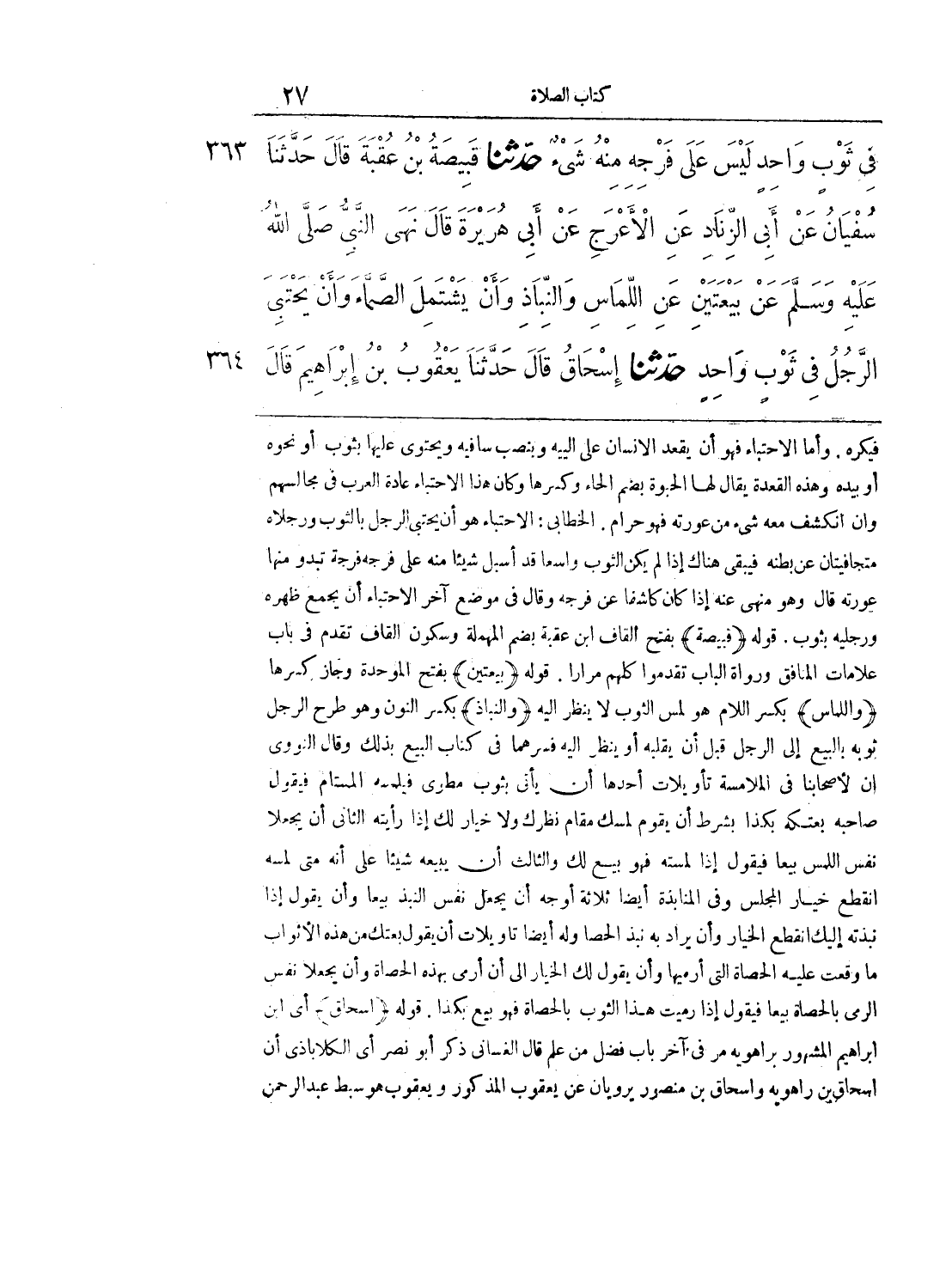 363 - حَدَّثَنَا قَبِيصَةُ بْنُ عُقْبَةَ قَالَ حَدَّثَنَا سُفْيَانُ عَنْ أَبِى الزِّنَادِ عَنِ الأَعْرَجِ عَنْ أَبِى هُرَيْرَةَ قَالَ نَهَى النَّبِىُّ - صلى الله عليه وسلم - عَنْ بَيْعَتَيْنِ عَنِ اللِّمَاسِ وَالنِّبَاذِ، وَأَنْ يَشْتَمِلَ الصَّمَّاءَ، وَأَنْ يَحْتَبِىَ الرَّجُلُ فِى ثَوْبٍ